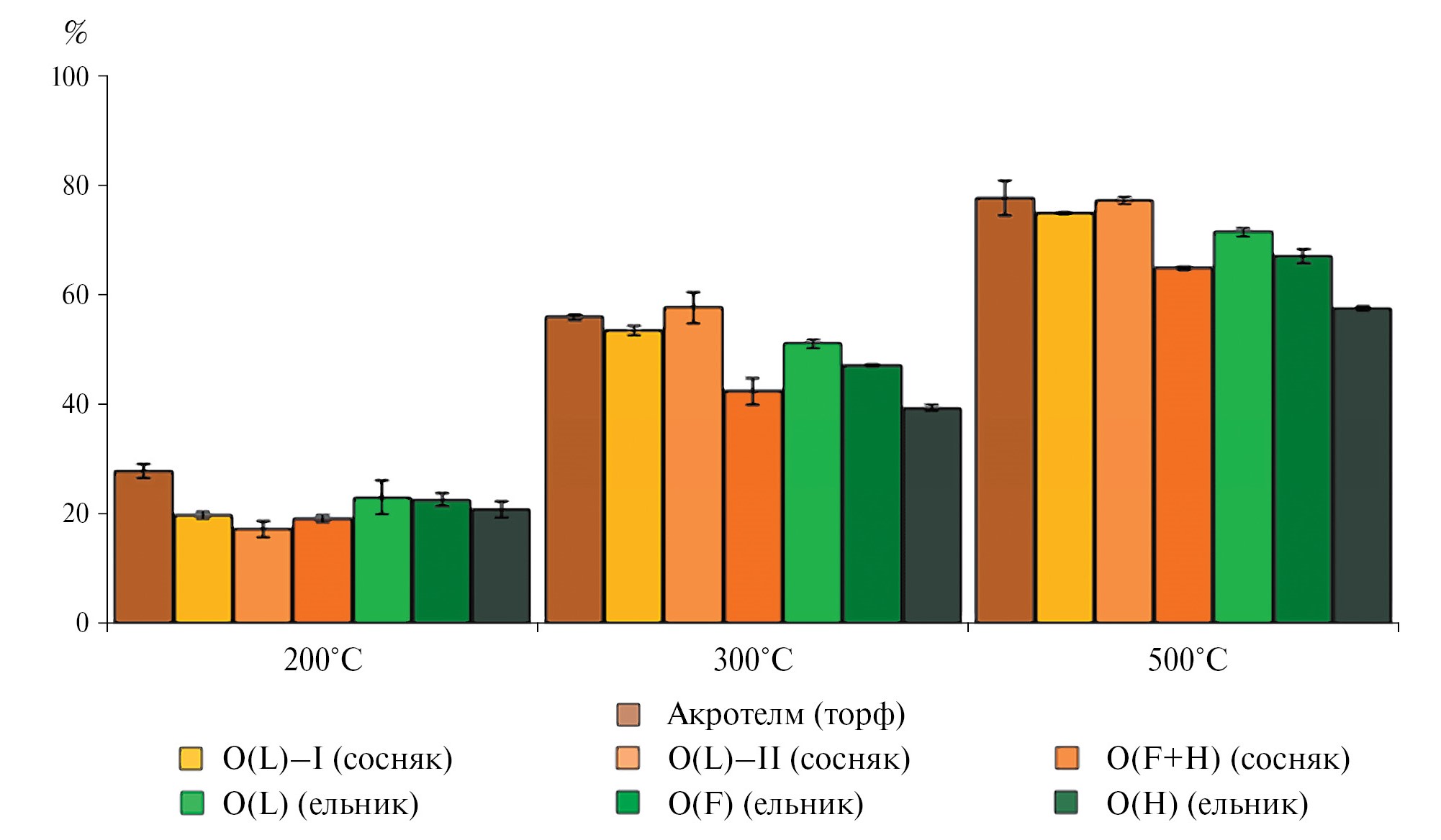 Общие свойства. Одним из наиболее существенных изменений в образцах органогенных горизонтов почв при нагревании является потеря массы. В торфяной олиготрофной почве потеря составила 28, 56 и 78% при 200, 300 и 500°C соответственно (рис. 1). В сосняке лишайниковом средняя потеря массы составила 10, 40 и 59% при 200, 300 и 500°C соответственно. В ельнике зеленомошном 12, 34 и 52% при 200, 300 и 500°C. Выявлено, что большая потеря веса характерна для верхних подгоризонтов органогенных горизонтов почв. Известно, что изменения при низких температурах (ниже 200°C) способны существенно влиять на биологические свойства [64, 65], особенно в органогенном горизонте почв. Физические свойства, такие как водоотталкивающая способность почвы и стабильность агрегатов, также могут быть изменены в результате горения [58]. Потеря веса при 200°C связана с дегидратацией, тогда как значительное снижение веса при 300 и 500°C объясняется разрушением органического вещества [47]. Известно, что значительная часть углерода может быть потеряна уже при температурах от 200 до 315°C при улетучивании органического материала [54]. В похожих работах, с применением термогравиметрического анализа, выявлено, что наиболее значительная часть органического материала способна выгорать уже при температуре близкой к 500°C [13, 41].