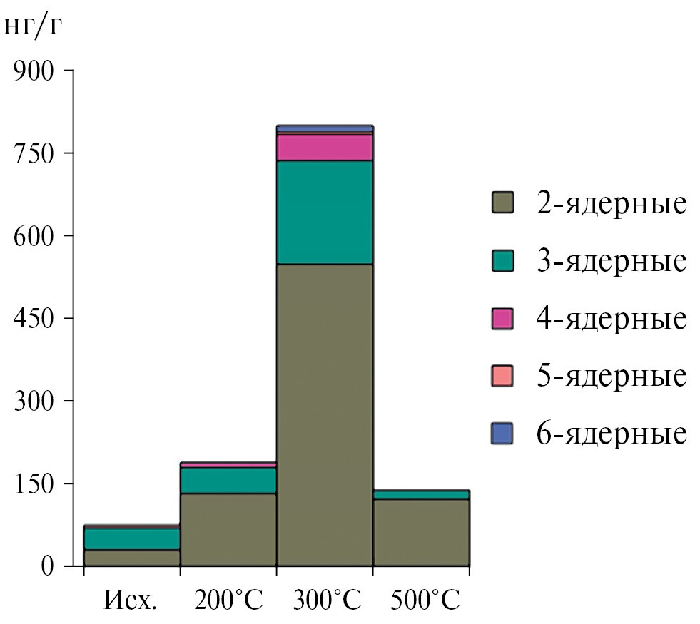 Воздействие температуры при 300°C привело к повышению содержания полиаренов в 10 раз, по сравнению с исходным образцом, и составило 801 нг/г с преобладанием легких ПАУ. Заметным отличием стало образование тяжелых ПАУ (до 15 нг/г). Вероятно, разложение естественных биополимеров в условиях высокой температуры и недостатка кислорода привело к образованию большего количества ПАУ [3]. При 500°C выявлено значительное уменьшение содержания ПАУ до 139 нг/г. Предположительно, в результате горения при температуре 500°C, ПАУ распадаются до более простых соединений либо высвобождаются в окружающую среду совместно с летучим материалом. Аналогичные данные об увеличении доли продуктов неполного сгорания при сжигании торфа в рамках эксперимента описаны ранее [11]. Было указано, что торф является потенциальным источником огромного количества продуктов неполного сгорания, включая ПАУ.