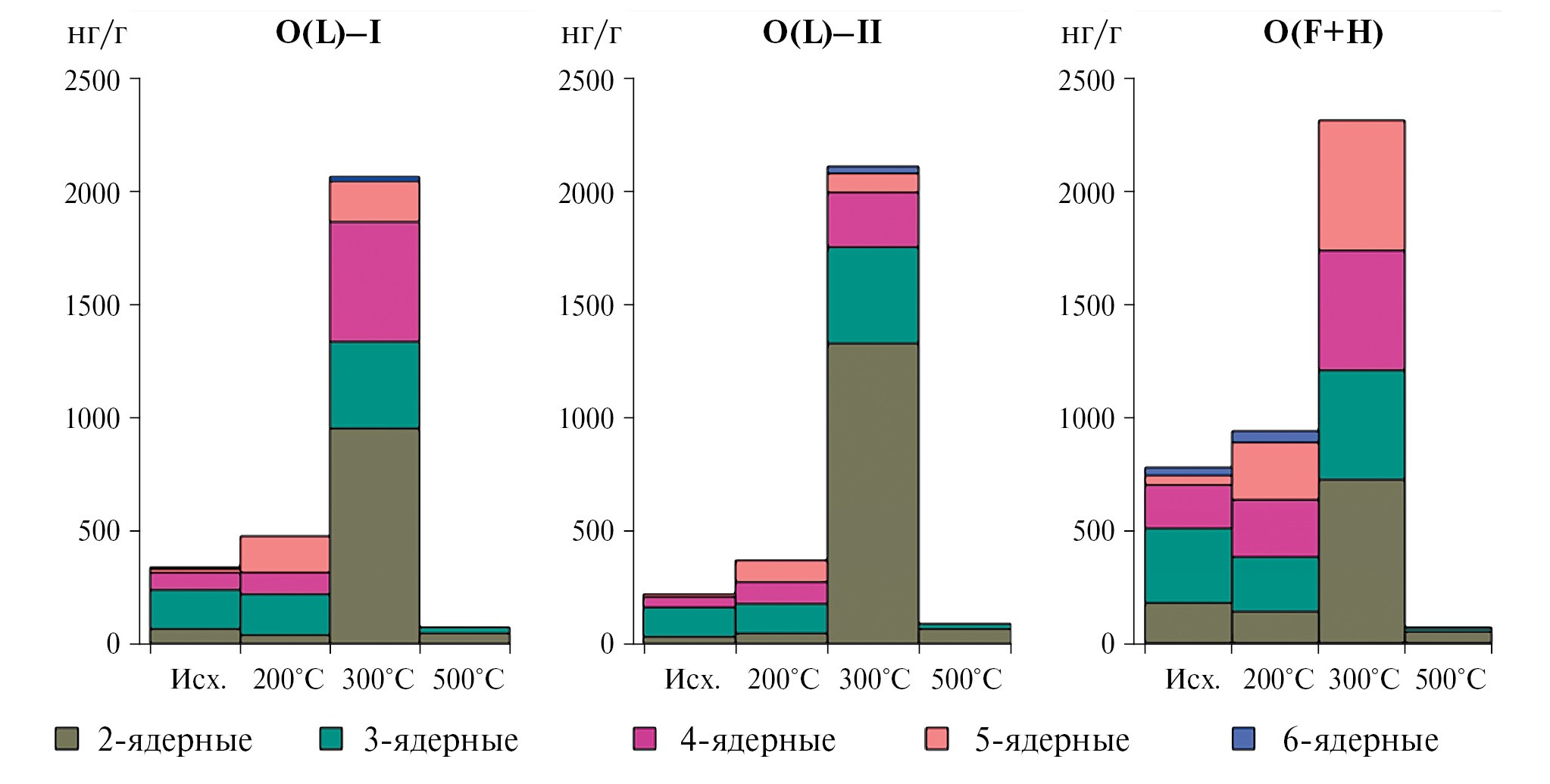 При температурах 200 и 300°C наблюдается увеличение содержания ПАУ во всех образцах сосняка лишайникового. В образце O(L)–I и O(L)–II содержание полиаренов при 300°C достигло пиковых значений и составило 2072 и 2119 нг/г соответственно. В наибольшей степени содержание ПАУ при 300°C увеличилось в нижнем подгоризонте (до 2326 нг/г). Стоит подчеркнуть, что немалая доля ПАУ в данном подгоризонте представлена тяжелыми соединениями (до 580 нг/г). Показано, что частично разложившиеся органические остатки, в которых уровень полиаренов изначально выше, в процессе горения образовали большее количество ПАУ, по сравнению с верхними подгоризонтами. При 500°C во всех образцах сосняка установлено понижение содержания ПАУ.