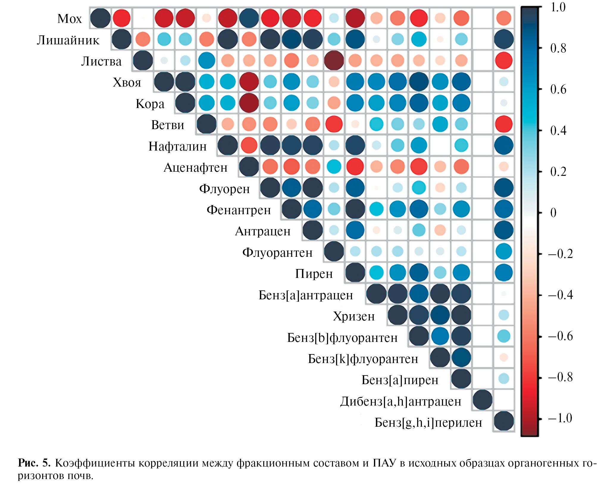 Согласно данным корреляции фракционного состава и индивидуальных ПАУ (рис. 5) выявлены некоторые закономерности. Проверка на значимость коэффициента корреляции выявила сильную положительную взаимосвязь между высоким содержанием хвои и содержанием пирена, бенз[a]антрацена, хризена, бенз[b]флуорантена, бенз[k]флуорантена и бензапирена в исходных образцах (r ~ 0.8, p < 0.05). Вероятно, кутикула хвоинок, содержащая воск, способна накапливать полиарены из атмосферы либо синтезировать их. Похожая, но менее сильная положительная корреляция выявлена между вышеназванными индивидуальными ПАУ и древесной корой.