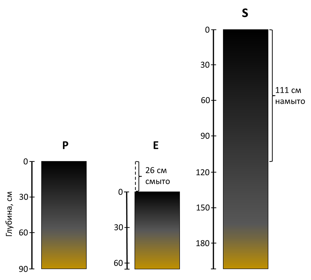 Рис. 1. Схема глубин гумусированной толщи в несмытом черноземе (P), среднеэродированном черноземе (E), стратоземе (S)