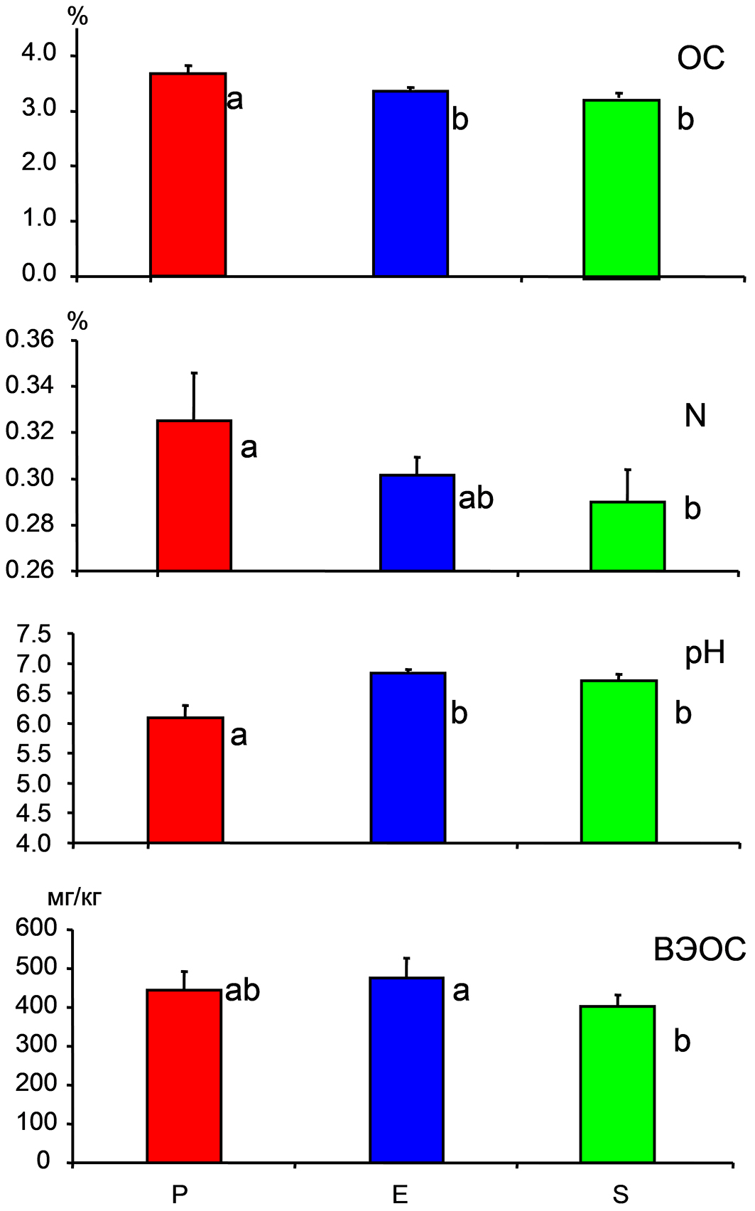 Рис. 2. Содержание в пахотных горизонтах почв органического углерода (ОС), азота (N); величина рН водной вытяжки и количество растворенного органического углерода, извлекаемое водной вытяжкой 1 : 5 (ВЭОС). Обозначения по оси Х: Р – несмытый чернозем; E – среднесмытый чернозем; S – стратозем. Одинаковые строчные латинские буквы у столбцов гистограмм указывают на незначимость различий средних по группам (дисперсионный анализ при α = 0.05)