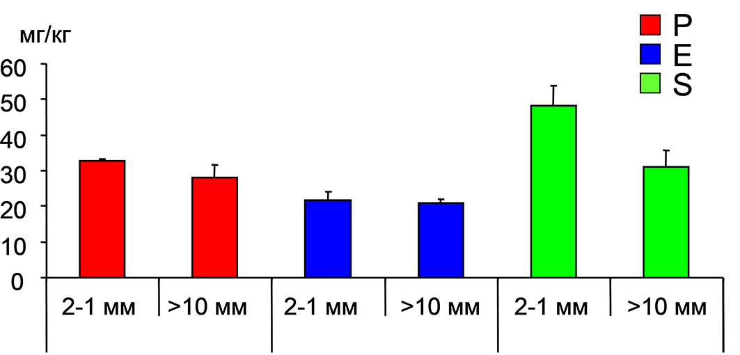 Рис. 3. Содержание водоэкстрагируемого азота в агрегатах 2–1 мм и глыбах > 10 мм пахотных горизонтов почв. Р – несмытый чернозем; E – среднесмытый чернозем; S – стратозем