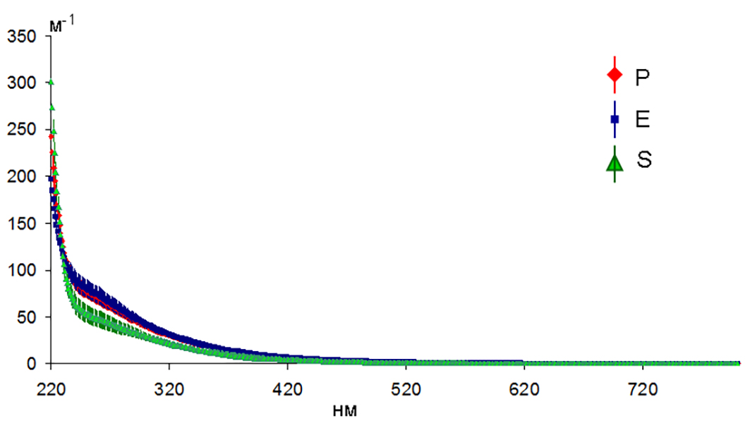 Рис. 4. Усредненные спектры поглощения ВЭОВ пахотных горизонтов почв. Приведены средние значения со стандартными отклонениями коэффициентов абсорбции Напиериана α(λ) – Napierian absorption coefficients в зависимости от длины волны. Р – несмытый чернозем; E – среднесмытый чернозем; S – стратозем