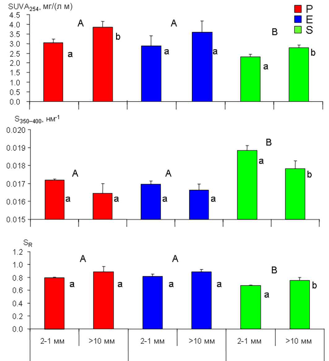 На спектре видно, что у ВЭОВ стратозема в области от 240 до 420 нм поглощение существенно ниже по сравнению с вариантами черноземов. Спектры ВЭОВ черноземов несмытого и эродированного, в свою очередь, весьма близки друг к другу. Все полученные зависимости характерны для ВЭОВ черноземов и схожих почв [14, 15, 53]. Спектральные данные использовали для расчета основных оптических характеристик (табл. 1). Основные оптические показатели спектров поглощения были близки к ранее полученным для ВЭОВ черноземов и к природному РОВ [14, 15 34, 53]. В целом, показатели ВЭОВ стратозема значимо отличались от ВЭОМ двух других вариантов, которые между собой не различались. Для индексов поглощения был проведен двухфакторный дисперсионный анализ с факторами ВЭОВ из варианта почвы и ВЭОВ из агрегатов 2–1 или > 10 мм. Для трех показателей: SUVA254, S350-400 и SR наряду с зависимостью от варианта почвы была обнаружена значимая зависимость их величин от структурных отдельностей, из которых были получены вытяжки (рис. 5).