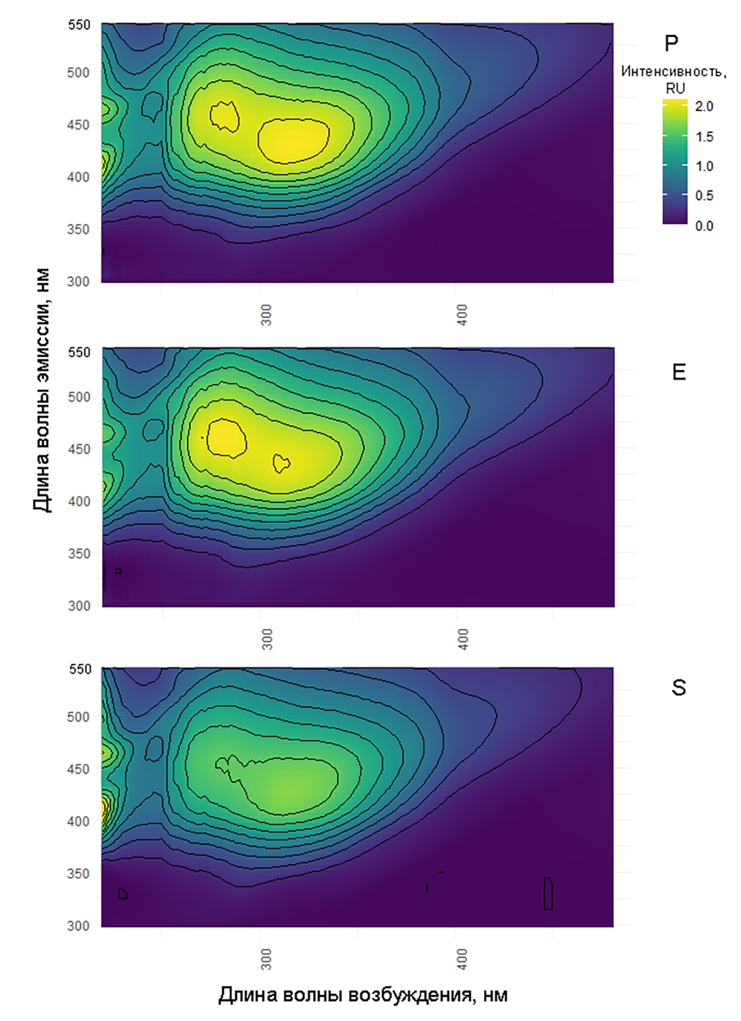Рис. 6. Примеры трехмерных спектров флуоресценции ВЭОВ пахотных горизонтов почв. Р – несмытый чернозем; E – среднесмытый чернозем; S – стратозем, RU – Рамановские единицы