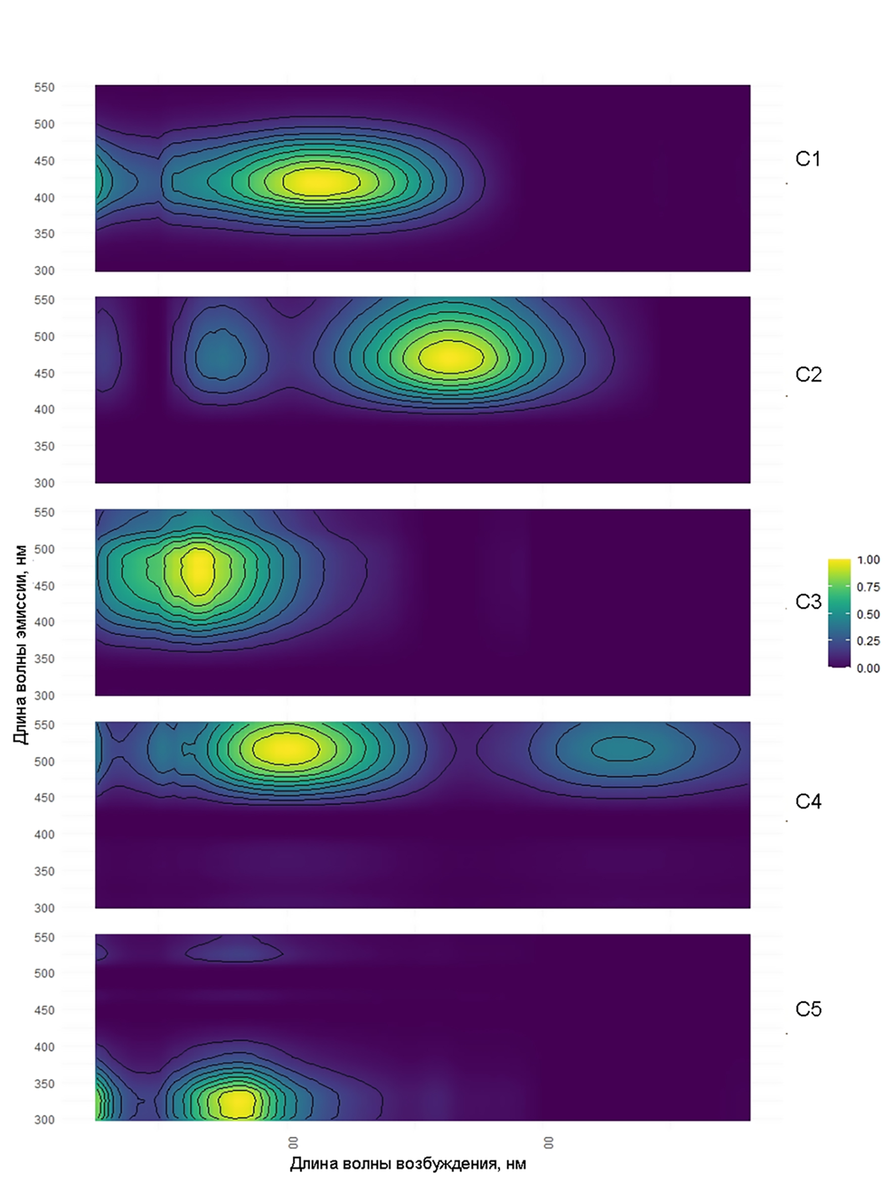 С4 компонент поглощает при 300 нм, и в области меньше 220 нм соответствующий максимум эмиссии наблюдается при 515 нм. К этому компоненту относят гуминоподобные, биоразлагаемые, в том числе большого размера, компоненты ОВ, исходя из того, что они плохо задерживаются PPL картриджами типа Bond Elute PPL, вероятно полисахаридной природы [18, 47, 55, 58].