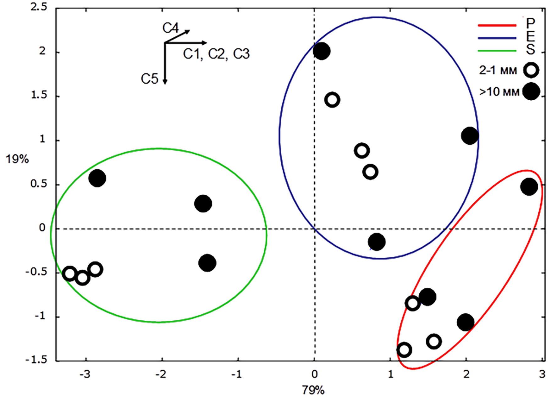Наиболее четко разница во флуоресцентных свойствах ВЭОВ структурных отдельностей видна в распахиваемом стратоземе. Здесь от компактного кластера 2–1 мм глыбы сдвинуты вверх и вправо, образуя непересекающуюся область, в их ВЭОВ меньше доля белкового компонента С5 и устойчивого ОВ (С2, С3) в ВЭОВ.