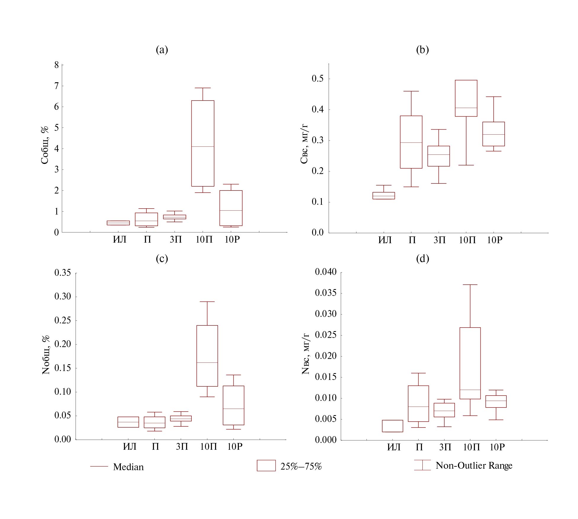 Химический анализ почв проводили в аккредитованной экоаналитической лаборатории и отделе почвоведения ИБ ФИЦ Коми НЦ УрО РАН. Общее содержание углерода (Собщ) и азота (Nобщ) в образцах опорных разрезов определяли на анализаторе EA-1100 (Carlo Erba). Для определения содержания общего углерода и азота была отобрана смешанная проба из каждого генетического горизонта в разрезе. Содержание водорастворимых фракций углерода (Cвс) и азота (Nвс) с учетом сезонной динамики (n = 5–6) определяли на анализаторе TOC-VCPN (Япония, Shimadzu) c модулем TNM-1. Результаты представлены при уровне значимости P = 0.95. Экстракцию водорастворимых веществ проводили деионизированной водой (ELGA Lab Water, Англия) при комнатной температуре при соотношении 1 : 50 (почва : вода) для минеральных горизонтов и 1 : 100 для органогенных горизонтов в пробирках BIOFIL. Суспензии встряхивали в течение часа на шейкере Heidolph Multi Reax (ускорении 6Х, 4600 об/мин) при комнатной температуре. Фильтрование проводили непосредственно после встряхивания на установках Millipore с использованием кварцевых фильтров (MN, Германия, с размером пор 0.4 мкм). Данные пересчитывали на воздушно-сухую навеску анализируемой пробы.