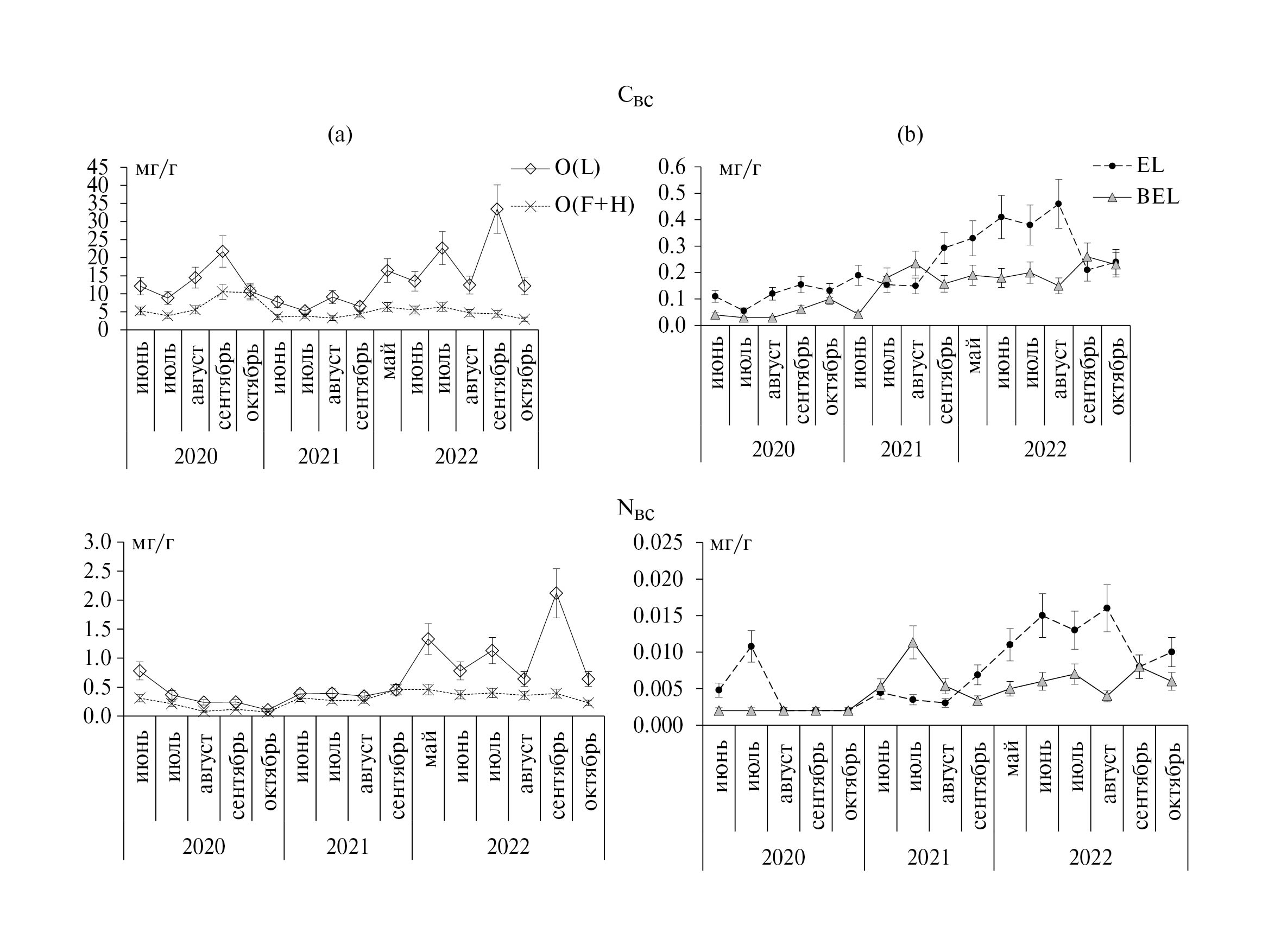 Содержание Nвс в почве 3П в первый год после рубки характеризуется увеличением в органогенном горизонте с течением времени с июля до сентября 0.248→0.312→0.371 мг/г, что выше показателей почвы ИЛ и близко к содержанию в почве пасечного участка. Особенно это выражено в осенние месяцы при увеличении влажности. На второй год содержание азота Nвс в органогенном горизонте 3П варьировало от 0.260 до 0.510 мг/г, что выше, чем на исходном участке и спустя год после рубки. В верхнем минеральном горизонте содержание азота водорастворимых соединений составляло в первый год после рубки от 0.003 мг/г в июле до 0.010 мг/г в сентябре 2021 г. Тенденция увеличения от летних месяцев к осенним сохраняется и для Nвс. Спустя два года после рубки содержание Nвс в элювиальном горизонте почвы 3П наоборот уменьшается от весенних к осенним месяцам с мая по октябрь от 0.009 до 0.005 мг/г. В целом содержание Nвс в минеральных горизонтах почвы ЗП спустя два года после рубки близко к показателям исходной почвы.