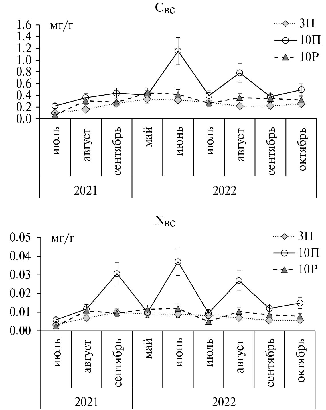 В турбированном горизонте почвы волока с десятью проходами 10П содержание азота водорастворимых соединений варьировало в первый год после рубки от 0.006 до 0.031 мг/г (рис. 5). Сохранилась тенденция к увеличению содержания Nвс от летних месяцев к осенним. В почве 10Р содержание азота составило в первый год 0.003–0.011 мг/г. На второй год после рубки выявлено неравномерное содержание азота Nвс в верхнем турбированном горизонте почвы 10П по месяцам, которое варьировало от 0.010 до 0.037 мг/г. Максимальные концентрации Nвс выявлены в июне и августе 2022 г. Для почвы с рекультивацией 10Р показатель Nвс на второй год после рубки носит более равномерный характер по месяцам исследованного года. Содержание углерода Cвс спустя два года после рубки составляет 0.005–0.012 мг/г, что близко к показателю года после рубки (0.003–0.011 мг/г), но ниже, чем в почве 10П ввиду полного отсутствия органогенного горизонта, который во многом определяет состав и свойства органических веществ [53].