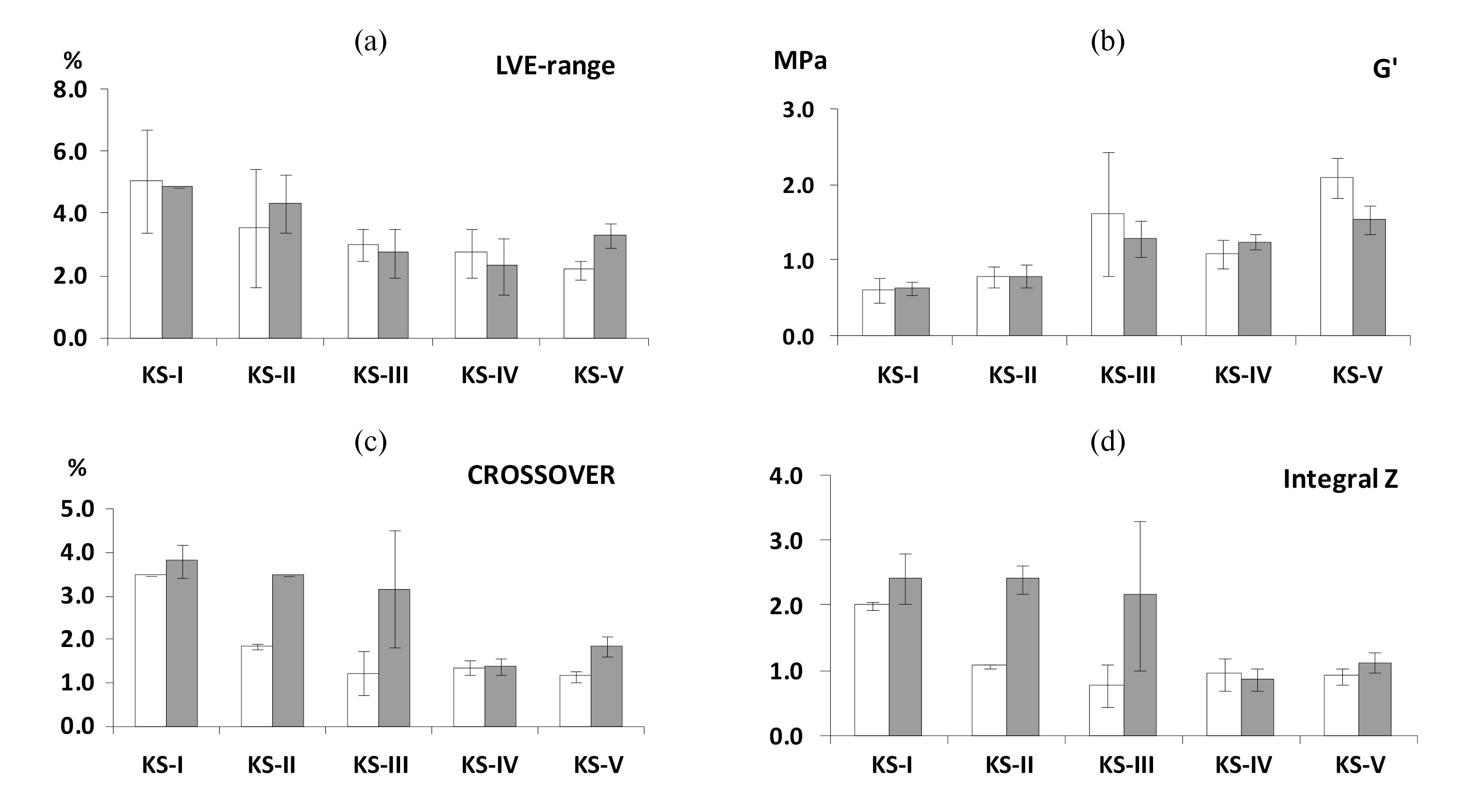 Рис. 2. Распределение реологических параметров (a – LVE-range, %, b – G’, MПa, c – Crossover, %, d – Integral Z) в текстурно-дифференцированных и криометаморфических горизонтах почв ключевых участков разных подзон: KS-I – южная тайга (горизонт ВТ), KS-II – средняя тайга (горизонт ВТ), KS-III – северная тайга (горизонт CRM), KS-IV – крайне северная тайга (горизонт CRM), KS-V – лесотундра (горизонт CRM)