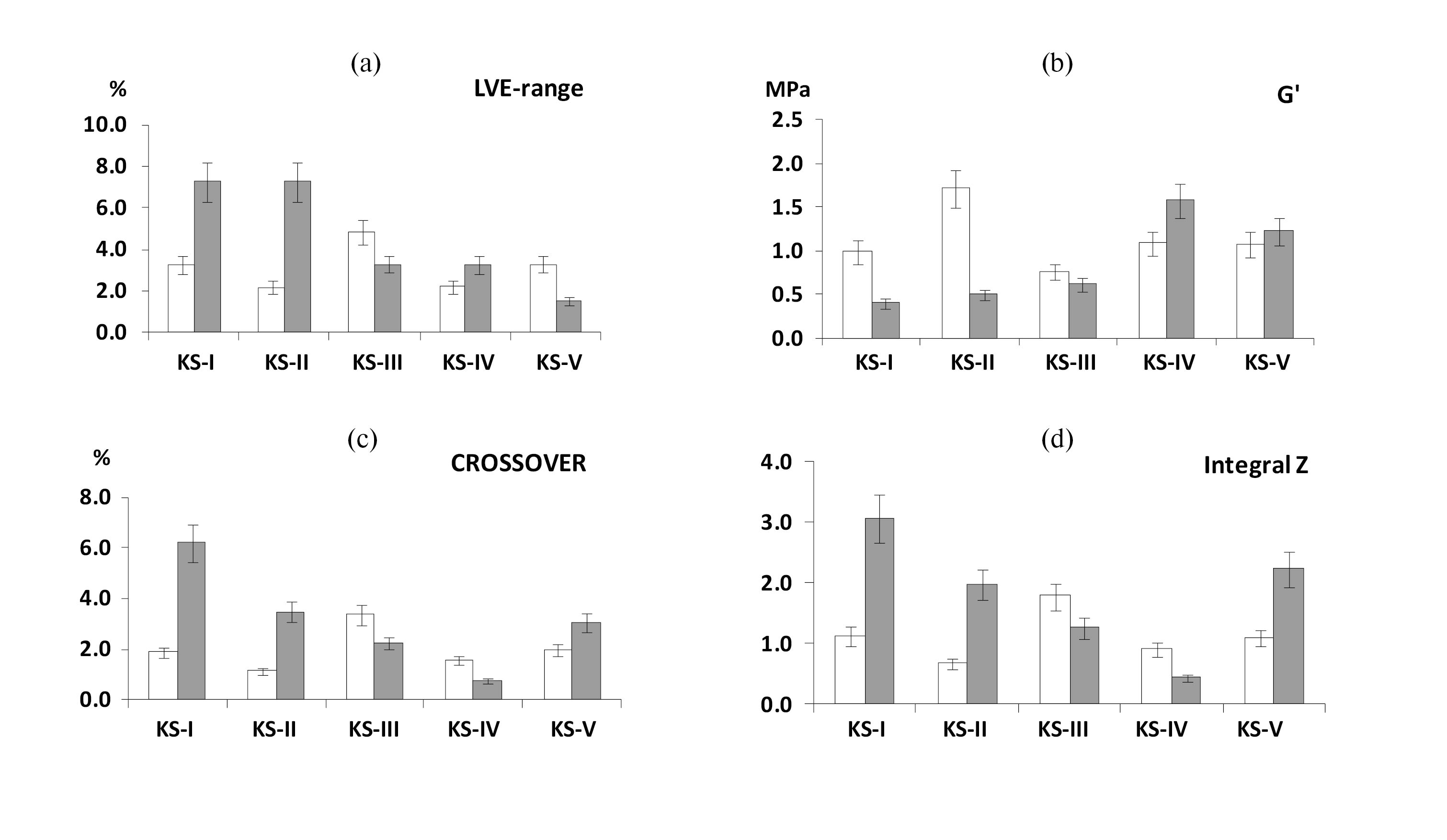 Рис. 3. Распределение реологических параметров (a – LVE-range, %, b – G’, MПa, c – Crossover, %, d – Integral Z) в гумусовоаккумулятивных и потечно-гумусовых горизонтах почв ключевых участков разных подзон: KS-I – южная тайга (горизонт АYg), KS-II – средняя тайга (горизонт ELhi,g), KS-III – северная тайга (горизонт ELhi,g), KS-IV – крайне северная тайга (горизонт ELhi,g), KS-V – лесотундра (горизонт ELhi,g)