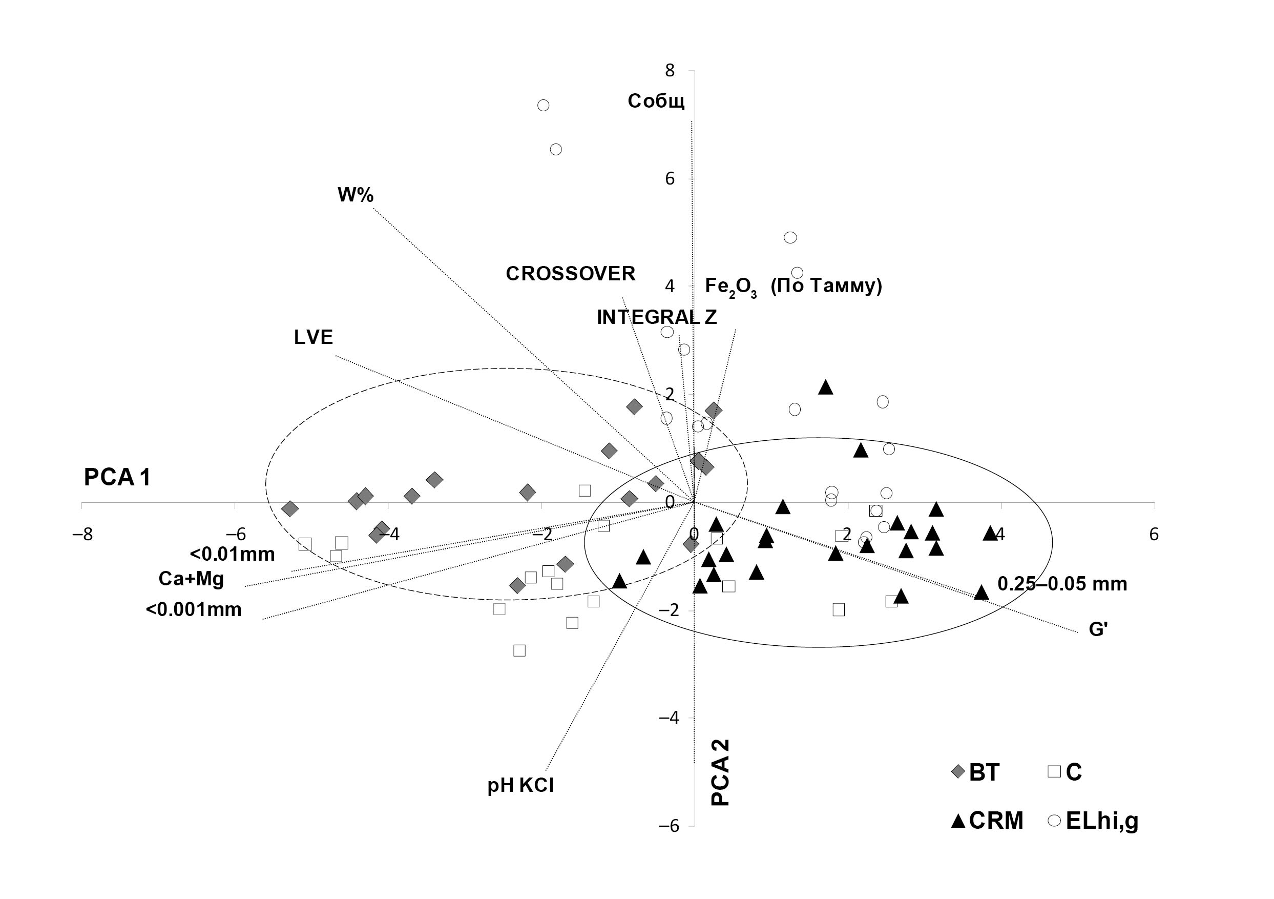 В почвах южной (разрез L-1, L-3) и средней (R-8-H, R-3-P) тайги жесткие межчастичные контакты со значениями G’ более 1.0 МПа приурочены только к верхней и средней части профиля (до глубины 53–56 см), в почве северной (R-3-H, R-2), крайне северной тайги (R-42, R-71) и лесотундры (R-4-H, R-4-2) относительно повышенной прочностью межчастичных взаимодействий отличается весь профиль до глубины более 100 см. Результаты статистической обработки полученного массива данных, выполненные методом главных компонент, показали достаточно четкое разграничение по реологическим параметрам текстурно-дифференцированных ВТ горизонтов полугидроморфных почв южной и средней тайги от криометаморфических горизонтов CRM светлоземов торфяных и торфянистых, представленных в северной части таежной зоны и лесотундры (рис. 4). Видно, что особенности реологического поведения криометаморфических горизонтов (CRM) определяются величиной жесткости межчастичных почвенных контактов – G’. Напротив, реологические свойства текстурно-дифференцированных горизонтов (ВТ) в большей степени определяются значениями линейного диапазона вязкоупругого повдения (LVE-range) и пластичной деформации (Crossover). Как уже отмечалось выше, характер реологического поведения во многом обусловлен физико-химическими свойствами почвы и почвообразующей породы. Расчет коэффициента корреляции Пирсона (табл. 4) выявил наиболее высокую взаимосвязь линейного диапазона вязкоупругой деформации (LVE-range) с содержанием в почве обменных оснований (r = 0.57, р < 0.001), частиц илистой фракции (r = 0.44, р < 0.001) и величиной влажности (r = 0.7, р < 0.001).