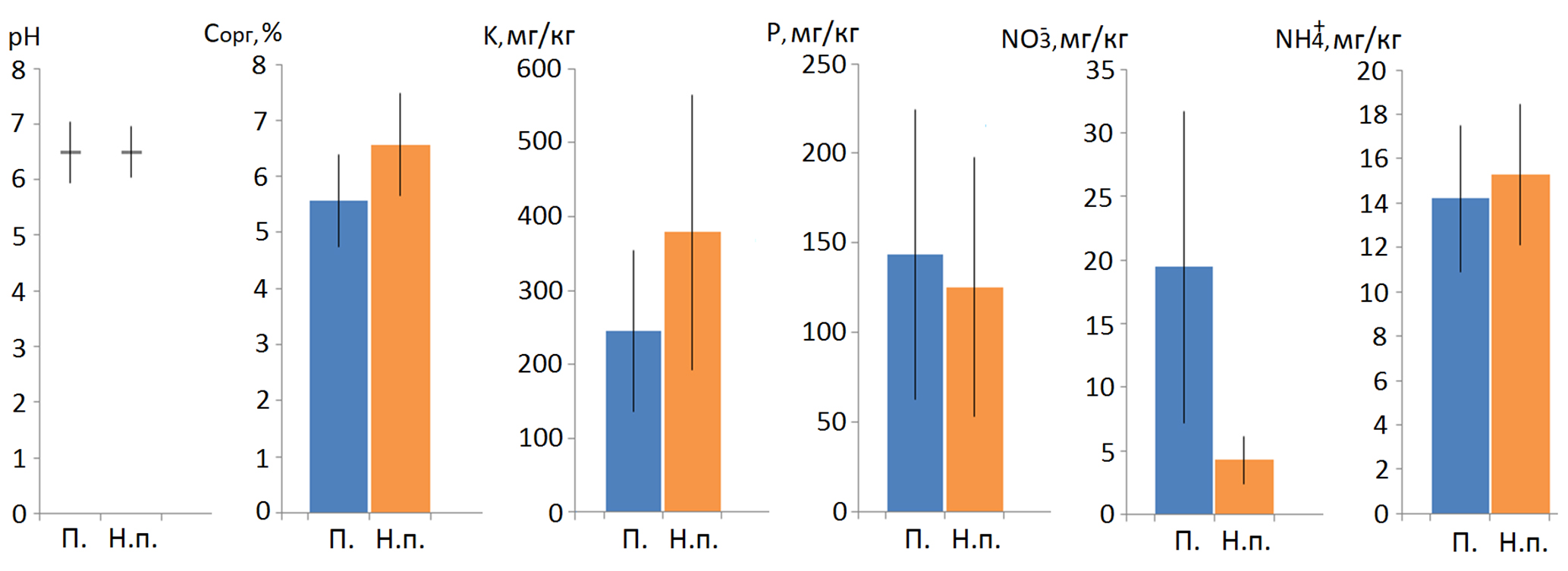 Рис. 2. Химические характеристики пахотных (П.) и непахотных (Н.п.) черноземов с их стандартными отклонениями: рН KCl, массовая доля органических веществ (Cорг, %), массовые концентрации обменного калия в пересчете на K2O, обменного фосфора в пересчете на P2O5, NO3– и NH4+ в пересчете на азот