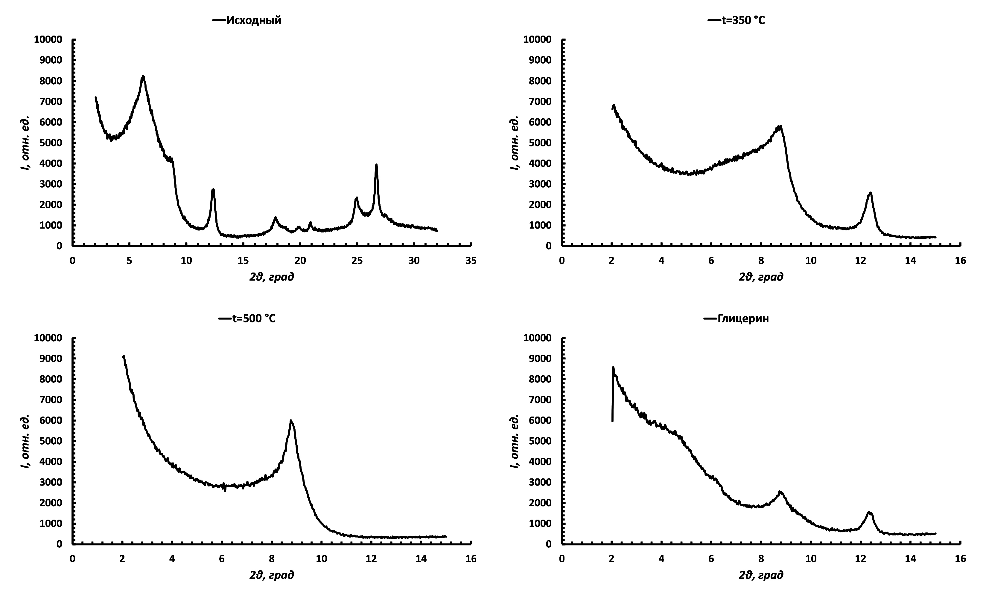 Рис. 1. Рентген-дифрактограммы образцов илистой фракции, извлеченной из типичного чернозема, подготовленных для минералогического анализа по методу Корнблюма (образцы: исходный – Mg-насыщенный, обработанный глицерином, прокаленные при 350 и 500°C)