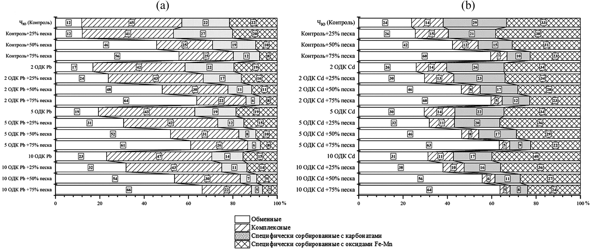 Более выраженные изменения в уменьшении прочности удерживания Cd данными компонентами происходит при загрязнении почв. Данный эффект усиливается на почвах с меньшей буферной способностью. При росте разбавления песком на 25, 50 и 75% увеличивается доля непрочносвязанных с оксидами Fe–Mn соединений Cd до 39–63, 42–73, 51–81% соответственно. В случае Pb данная тенденция менее выражена: рост до 22–33, 24–33, 27–38% непрочносвязанных соединений с оксидами Fe–Mn соответственно.
