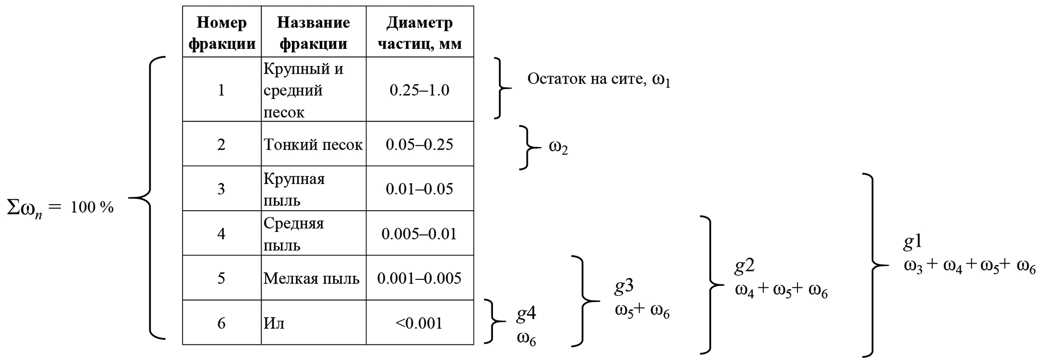 Рис. 1. Схема фракционирования согласно методике Качинского: g – номер аликвотной части суспензии почвы; ω1–ω6 – массовая доля отдельных гранулометрических фракций.