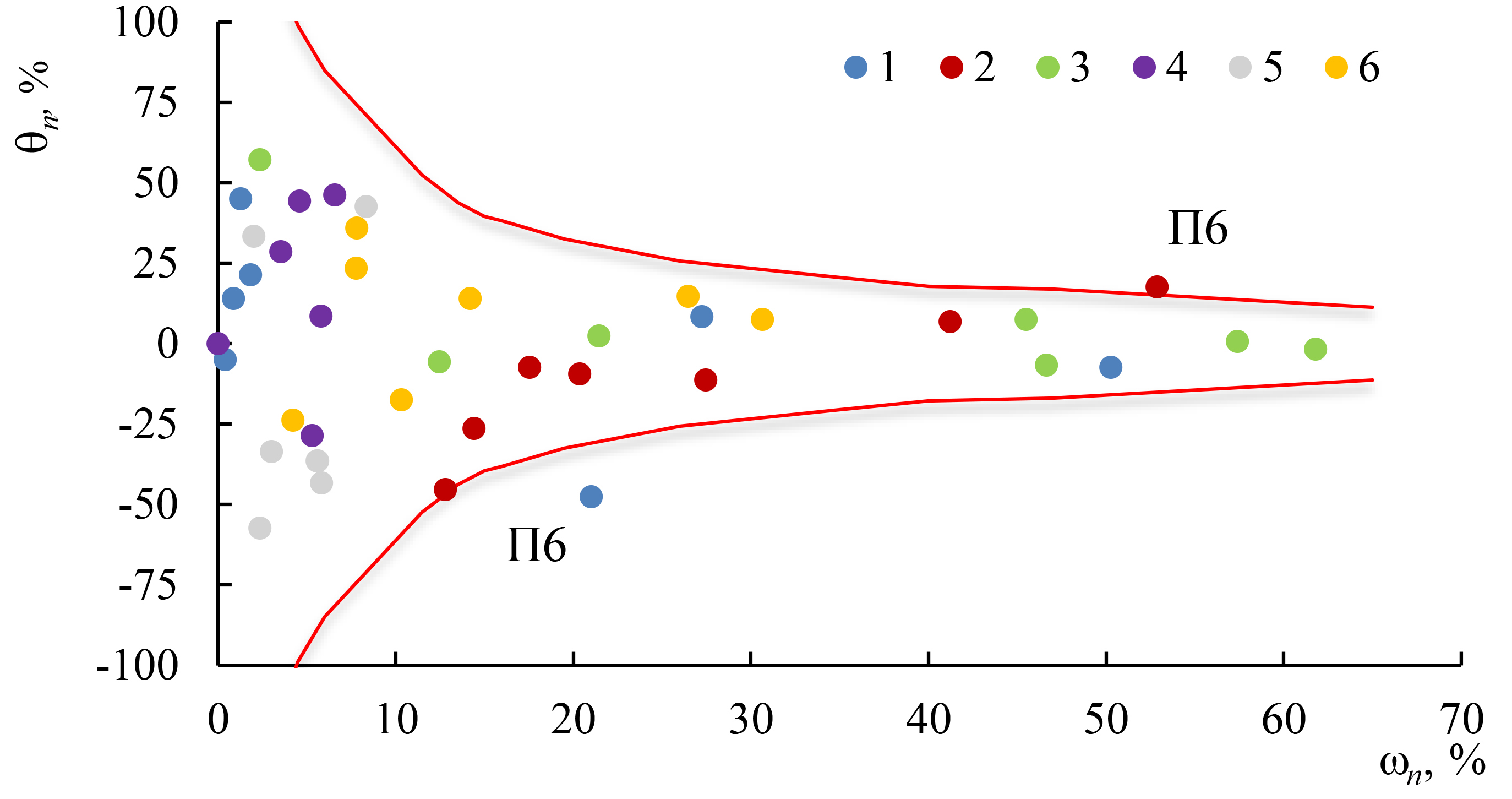 Для оценки метрологических характеристик измерений ωn фракций, значения полученного массива данных проверяли на отсутствие промахов по критерию Граббса, независимость от времени исследований и соответствие нормальному распределению согласно [13, 14, 30, 31]. При числе результатов измерений менее 15 их принадлежность к нормальному распределению не проверяют. Однако при этом вычисление метрологических характеристик результатов измерений допускается только в том случае, если заранее известно, что результаты измерений принадлежат нормальному распределению. Статистическую обработку данных выполняли в соответствии с алгоритмом, изложенным в руководствах [12, 30].