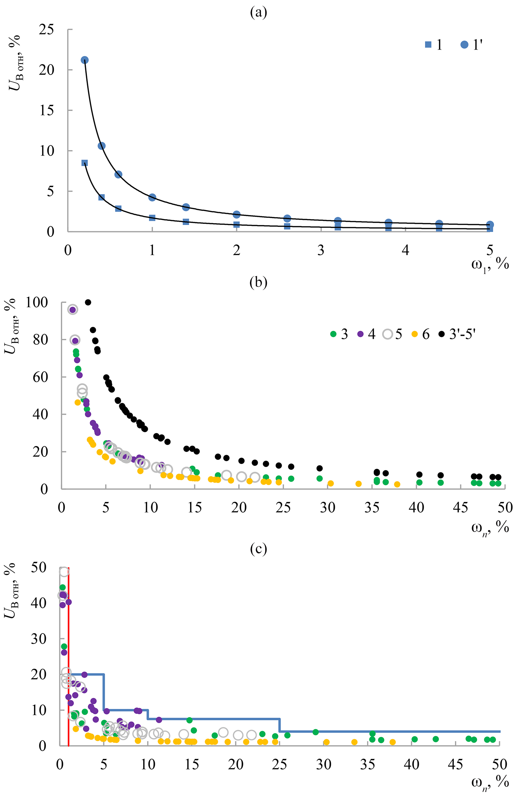 Таким образом, при исследовании навески почвы 25 г использование весов 1 и 2 класса точности равнозначно при высоком содержании ЭЧП, входящих в состав фракций (ωn ≥ 10%). При меньших значениях ωn использование весов 1 класса точности позволяет снизить UВ отн результатов исследований ГС почвы до 20% в первом поддиапазоне массовой доли ЭЧП (ωn от 1 до 5%) (рис. 6c).