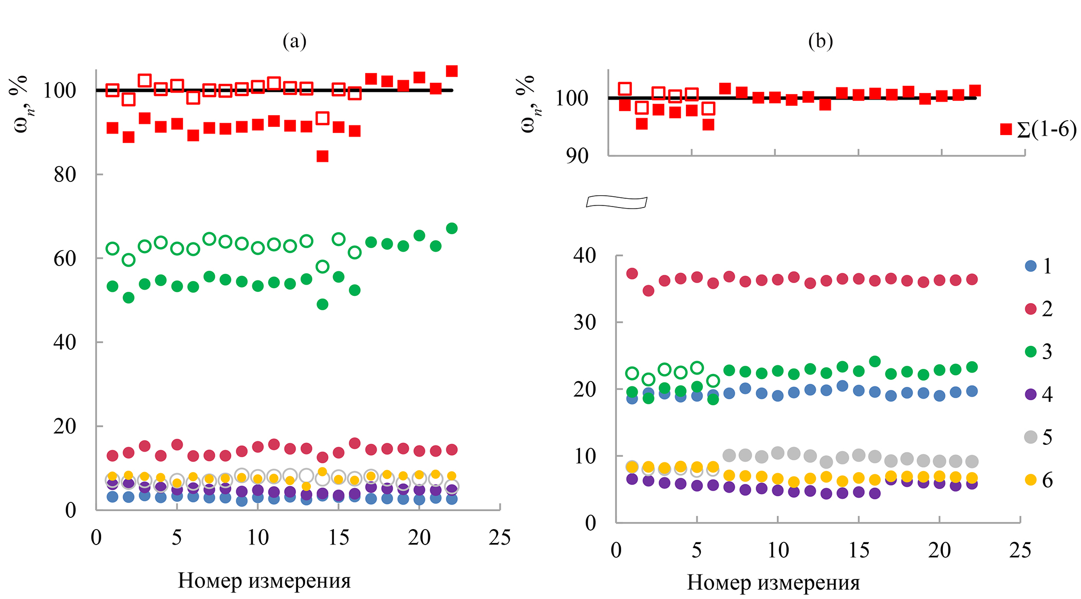 Рис. 8. Распределение массовой доли ЭЧП фракций 1–6 и их суммы Σ(1–6) (ωn) П49 (а) и П50 (b). Незаштрихованными значками фракций 3 и Σ(1–6) обозначены ωn, полученные после введения поправки (пояснения в тексте).