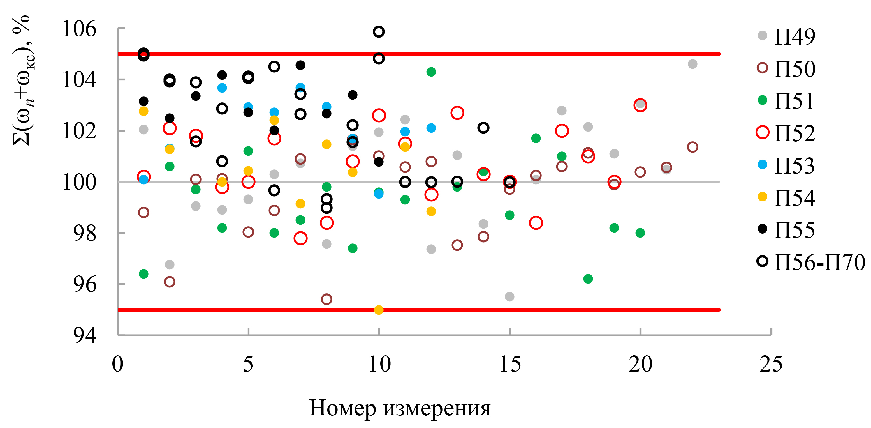 Рис. 9. Результаты контроля суммы массовых долей ЭЧП шести фракций и кислоторастворимых соединений Σ(ωn+ωкс), полученных при анализе П49–П70 согласно прописи ММК.