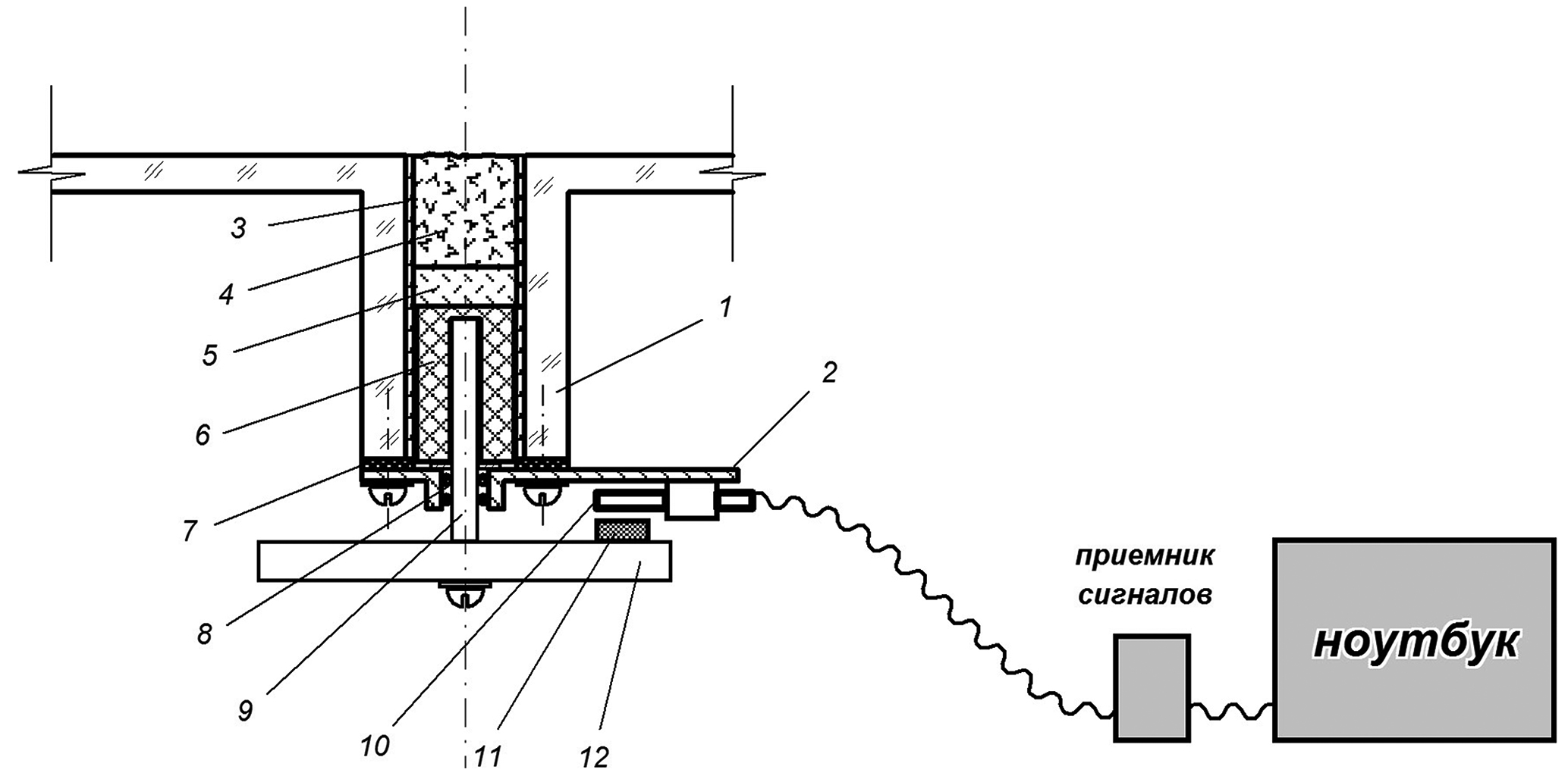 Измерительное устройство состоит из датчика, приемника сигналов, ноутбука (компьютера) и программного обеспечения. На рис. 1 представлена подробная схема кассетоприемника гидродинамической трубы, оснащенной измерительным устройством “Посейдон”.