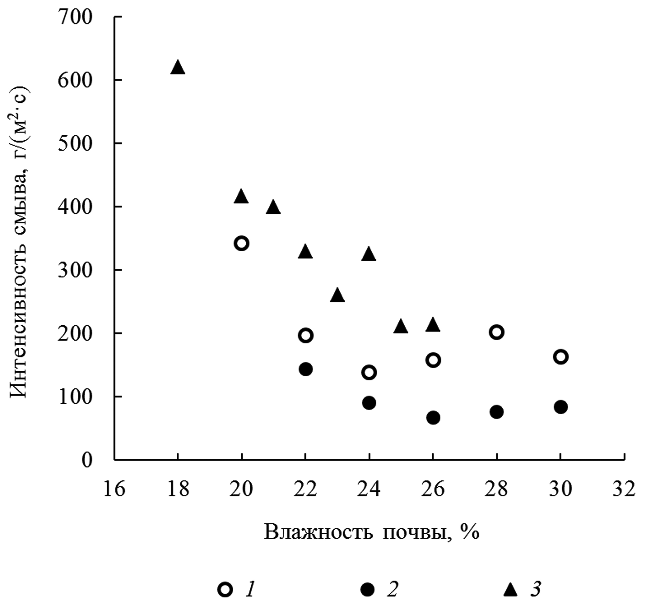 Рис. 2. Зависимость интенсивности размыва почвенных образцов от их влажности при скорости потока в гидродинамической трубе 1.2 м/с: 1 – агрочернозем при вертикальной загрузке; 2 – агрочернозем при горизонтальной загрузке; 3 – агросерая почва при горизонтальной загрузке.