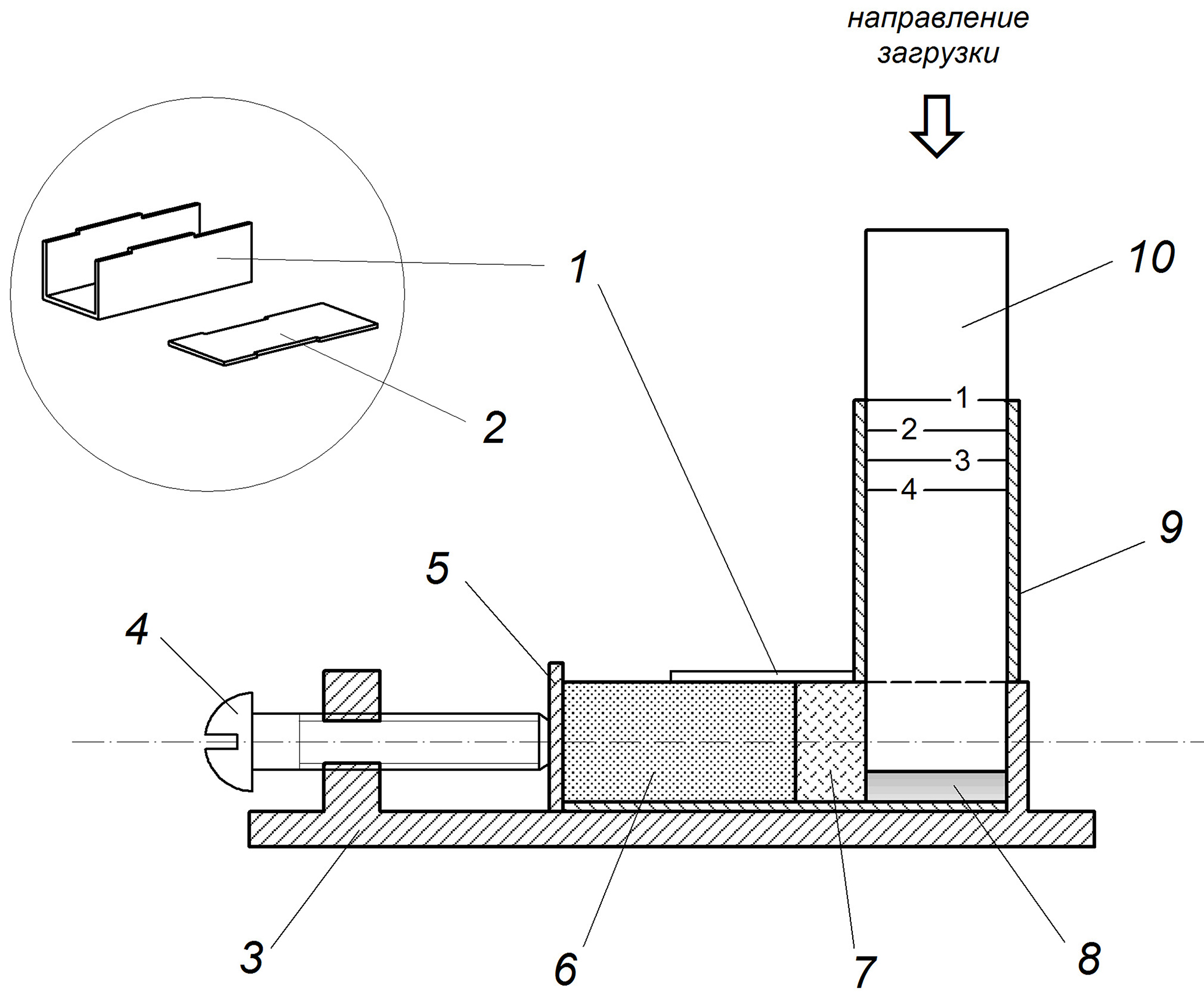 Рис. 3. Устройство приспособления для горизонтального формирования почвенного образца: 1 – кассета со снятой боковой стенкой 2; 3 – корпус устройства с прижимным винтом 4; 5 – прижимная пластина; 6 – технологический вкладыш; 7 – проставка; 8 – 1-й, уплотненный слой почвы; 9 – надставка; 10 – уплотняющий стержень.