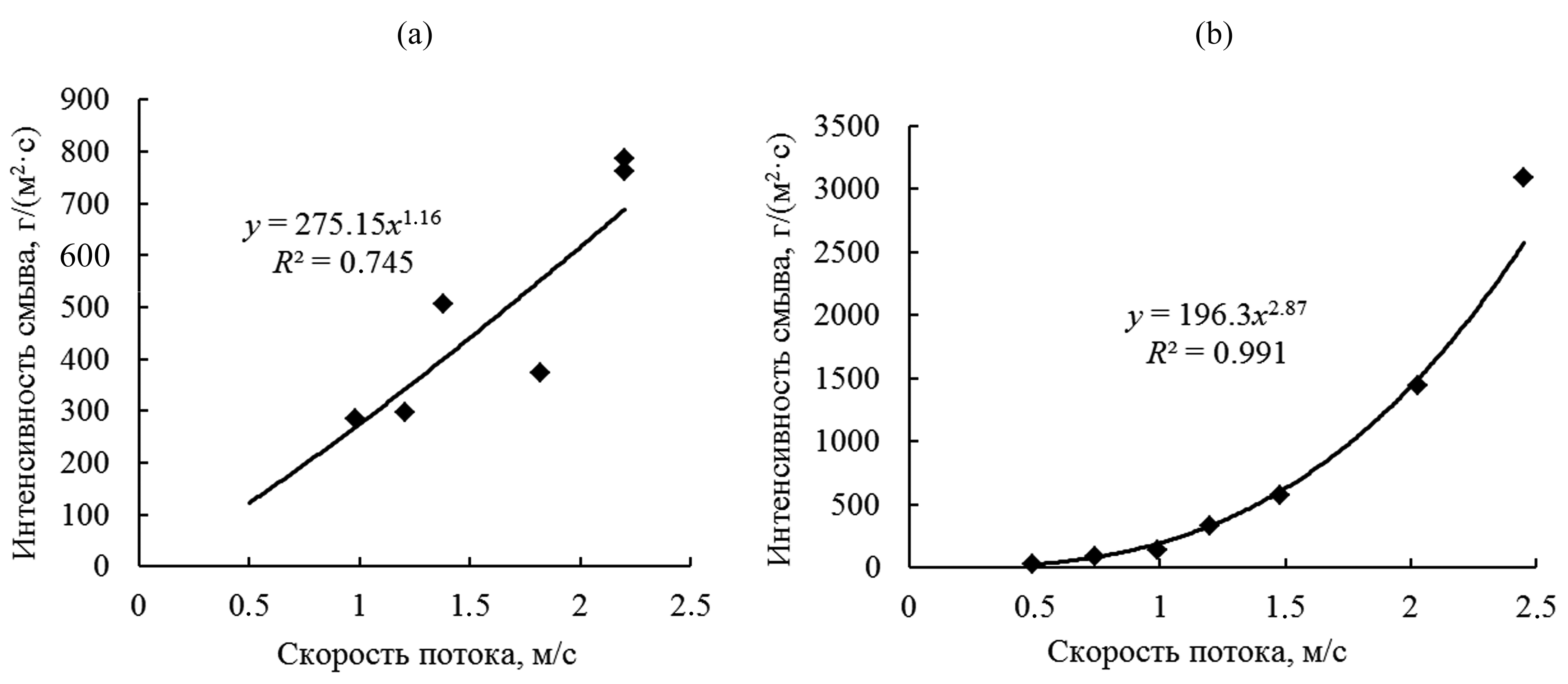 Рис. 5. Зависимость интенсивности смыва агросерой почвы от скорости водного потока при вертикальном (a) и горизонтальном (b) направлениях загрузки образцов.