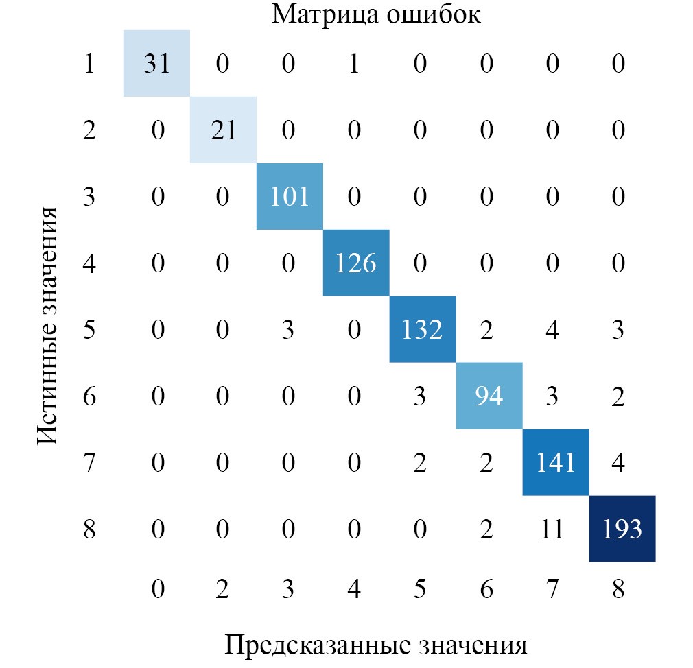 Опираясь на составленную таблицу в программе Random Forest, провели классификацию космического изображения ключевого участка с выделением 8 классов. Полученную статистическую модель оценивали по следующим параметрам [35]: