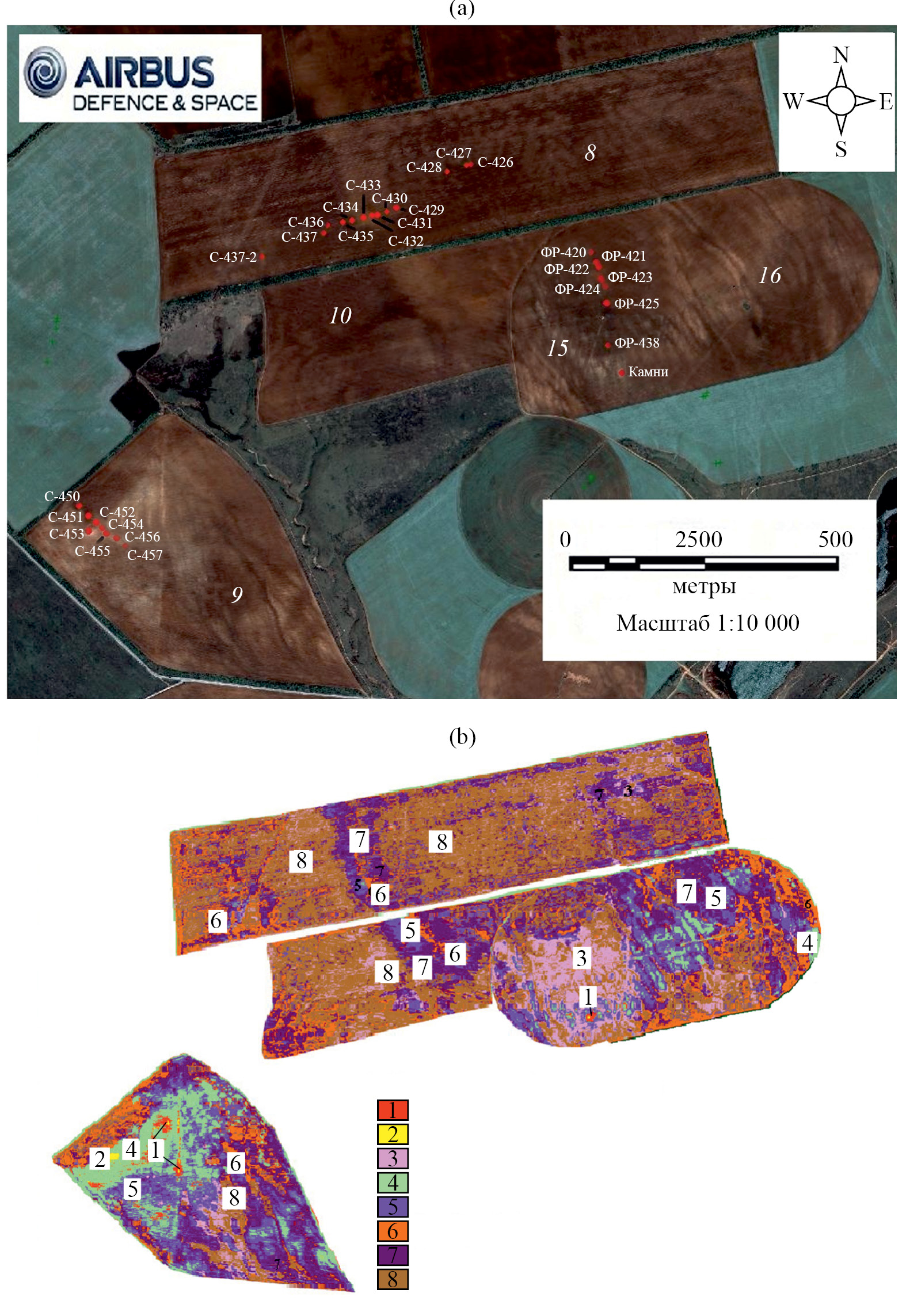 Рис. 3. Ключевой участок исследований и точки полевого опробования (2022 г.) на космическом снимке со спутника Pleiades (25.04.2020) (a) (на снимке крупным курсивом указаны номера полей, буквенными и цифровыми значениями – номера точек опробования); результат классификации космического изображения на 8 классов (b): 1 – каменистые с поверхности почвы; 2 – песчаные очень слабо каменистые с поверхности почвы, не имеющие вскипания от HCl; 3 – очень слабо каменистые агросолонцы с осветленными корочками на поверхности, не имеющими вскипания; 4 – очень слабо каменистые супесчаные почвы, не вскипающие с поверхности; 5 – очень слабо каменистые вскипающие с поверхности почвы на двучленных отложениях с мощностью первого литологического слоя суглинков около полуметра; 6 – очень слабо каменистые не вскипающие с поверхности почвы на двучленных отложениях с мощностью первого литологического слоя суглинков около полуметра; 7 – вскипающие с поверхности почвы на палево-бурых суглинках, имеющих мощность 70 см и больше; 8 – не вскипающие с поверхности почвы на палево-бурых суглинках, имеющих мощность 70 см и больше