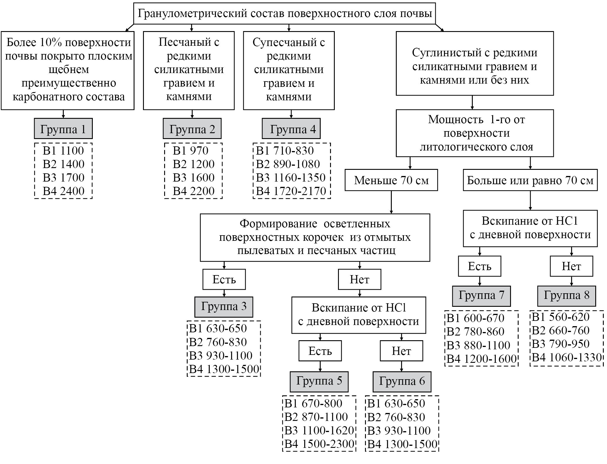 Рис. 4. Схема признаков почв, влияющих на спектральную яркость космического снимка (Pleiades, 25.04.2020). В пунктирных рамках указаны интервалы средней спектральной яркости в четырех каналах для нескольких точек опробования в каждой группе почв (группы 4–8) и безинтервальные значения для одной точки опробования (группы 1–2)