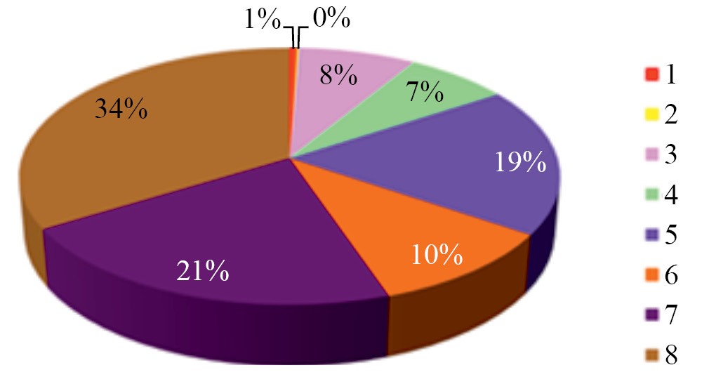 Рис. 5. Долевое участие восьми групп почв на ключевом участке, выделенных по спектральным характеристикам космического снимка. Обозначения групп см. рис. 3