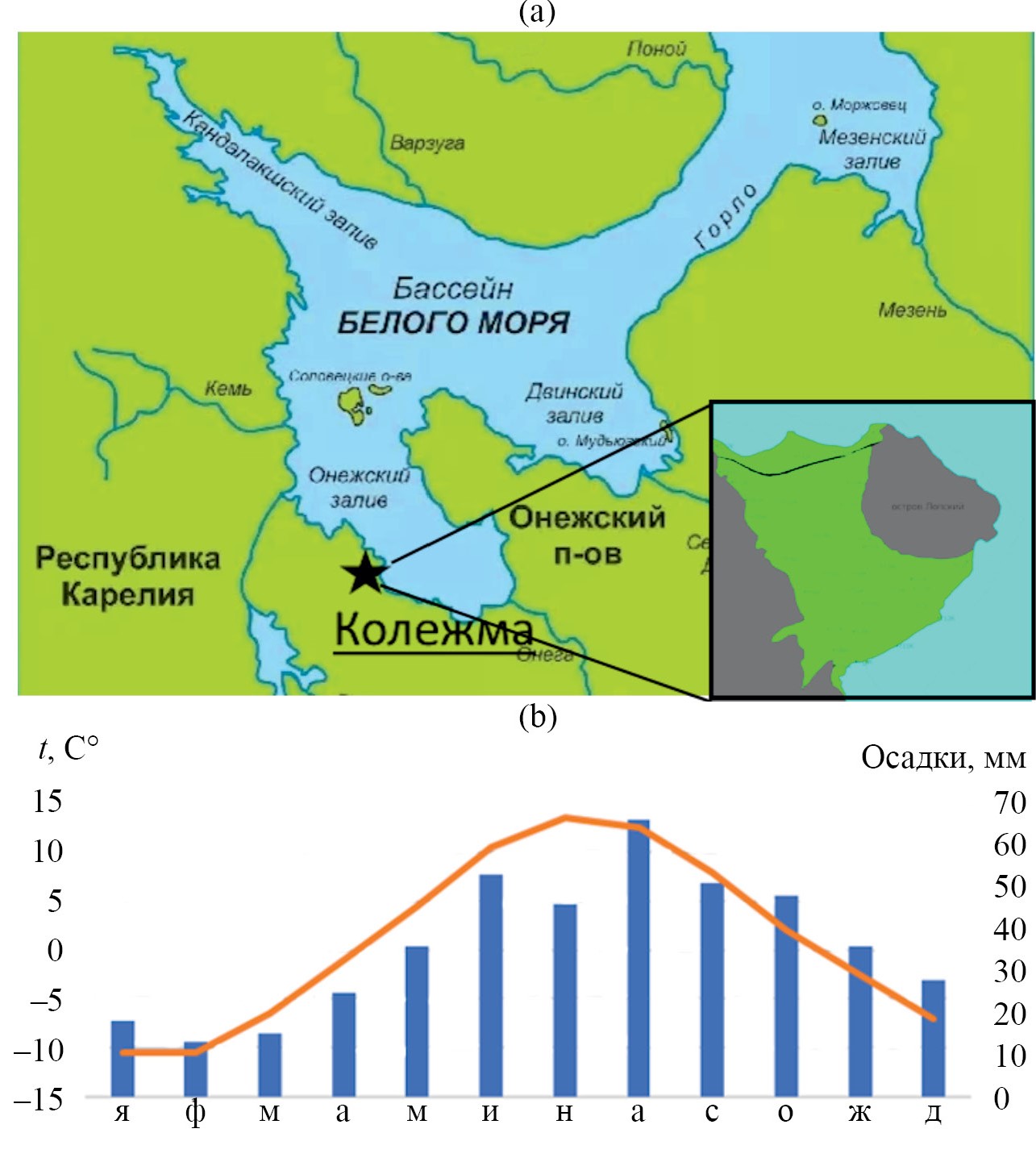 Рис. 1. Географическое положение (а) и климатические характеристики (b) района исследований