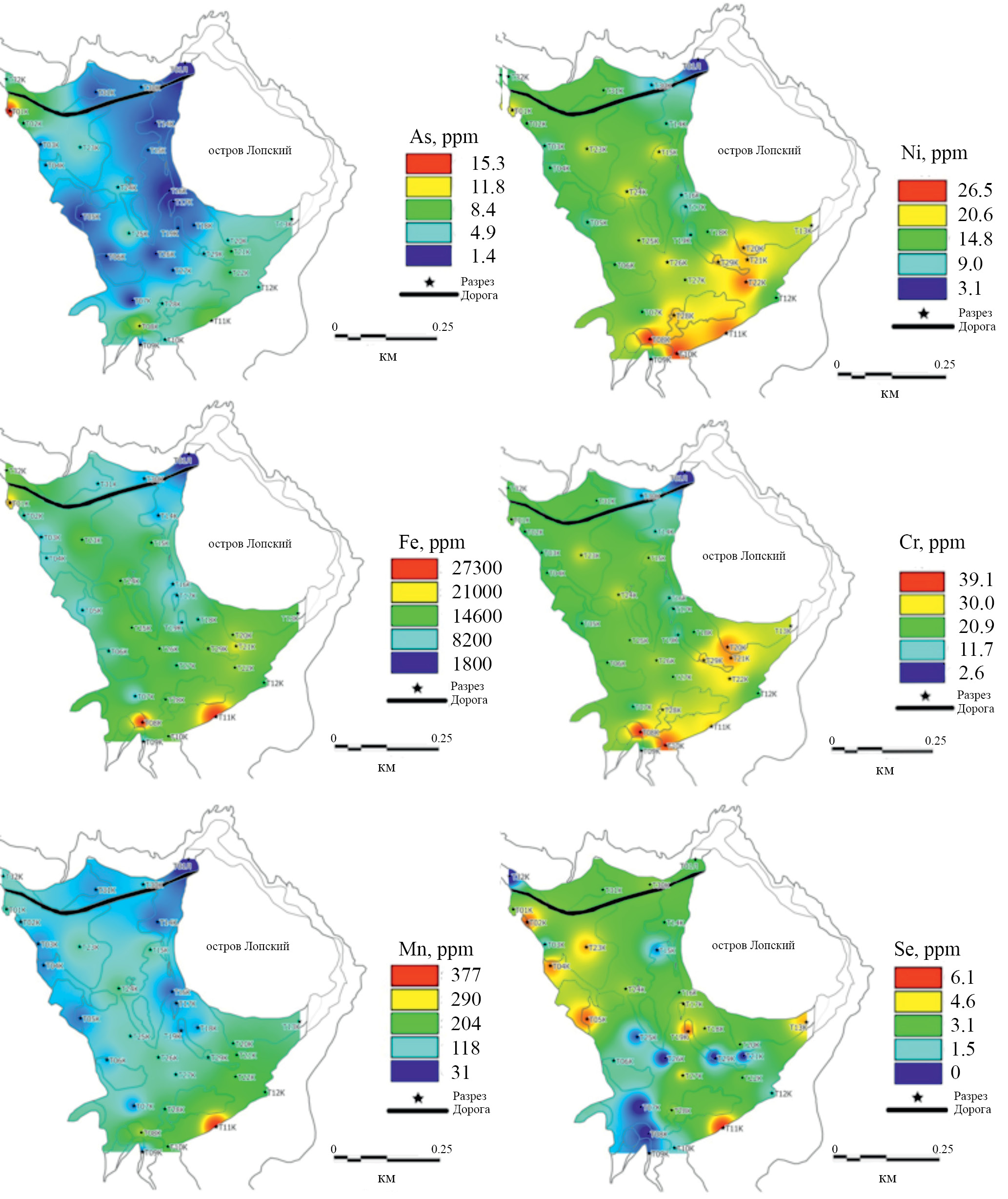 Пространственное распределение Fe и Mn. Содержание Fe в почвах велико по сравнению с другими микроэлементами, достигая местами 27 300 ppm, что соответствует валовому содержанию Fe в автоморфных зональных почвах [1]. Пространственное распределение Fe показывает приуроченность максимальных концентраций к южному побережью и центральной части томболо, которая находится в понижении, т.е. соответствует заливаемым почвам, в том числе соленых луж и озер. Теоретически, должен происходить вынос Fe из переувлажненных позиций за счет его восстановления, в реальности наблюдаем обратную картину. Характерно, что распространение Fe не соответствует распределению его обычного спутника по геохимии в почве – Mn, который концентрируется только на южной береговой линии. При этом содержание Mn составляло от 30 до 377 ppm, что практически укладывается в диапазон концентраций, сообщаемых для автоморфных почв региона – от 36 до 1500 ppm [1]. Мы приписываем разное геохимическое поведение Fe и Mn отчасти различной подвижности этих элементов в разных диапазонах рН и Eh, отчасти – связанности Fe с распространением пирита на томболо. Предельно допустимая концентрация Mn составляет 1500 ppm, т.е. на исследованном участке она нигде не превышена.