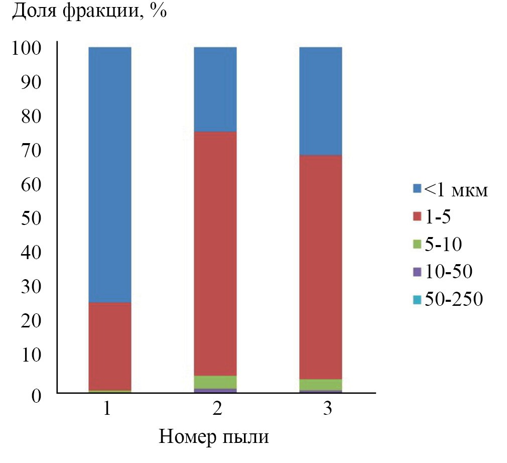 Анализируя гранулометрический состав образцов пылевых выпадений (рис. 1), можно сказать, что преобладающими в них являются фракции ила (<1 мкм) и мелкой пыли (1–5 мкм). Содержание фракций больше 5 мкм составляет менее 5%. Подобный гранулометрический состав можно объяснить местом отбора проб, все 3 образца отбирали с высоты 0.5 м и более в условиях сильных ветровых потоков от активного трафика, что исключало наличие крупных гранулометрических фракций. Пыль 1 имеет более тонкий гранулометрический состав, чем пыль 2 и 3, которые, в свою очередь, имеют схожее между собой соотношение гранулометрических фракций.