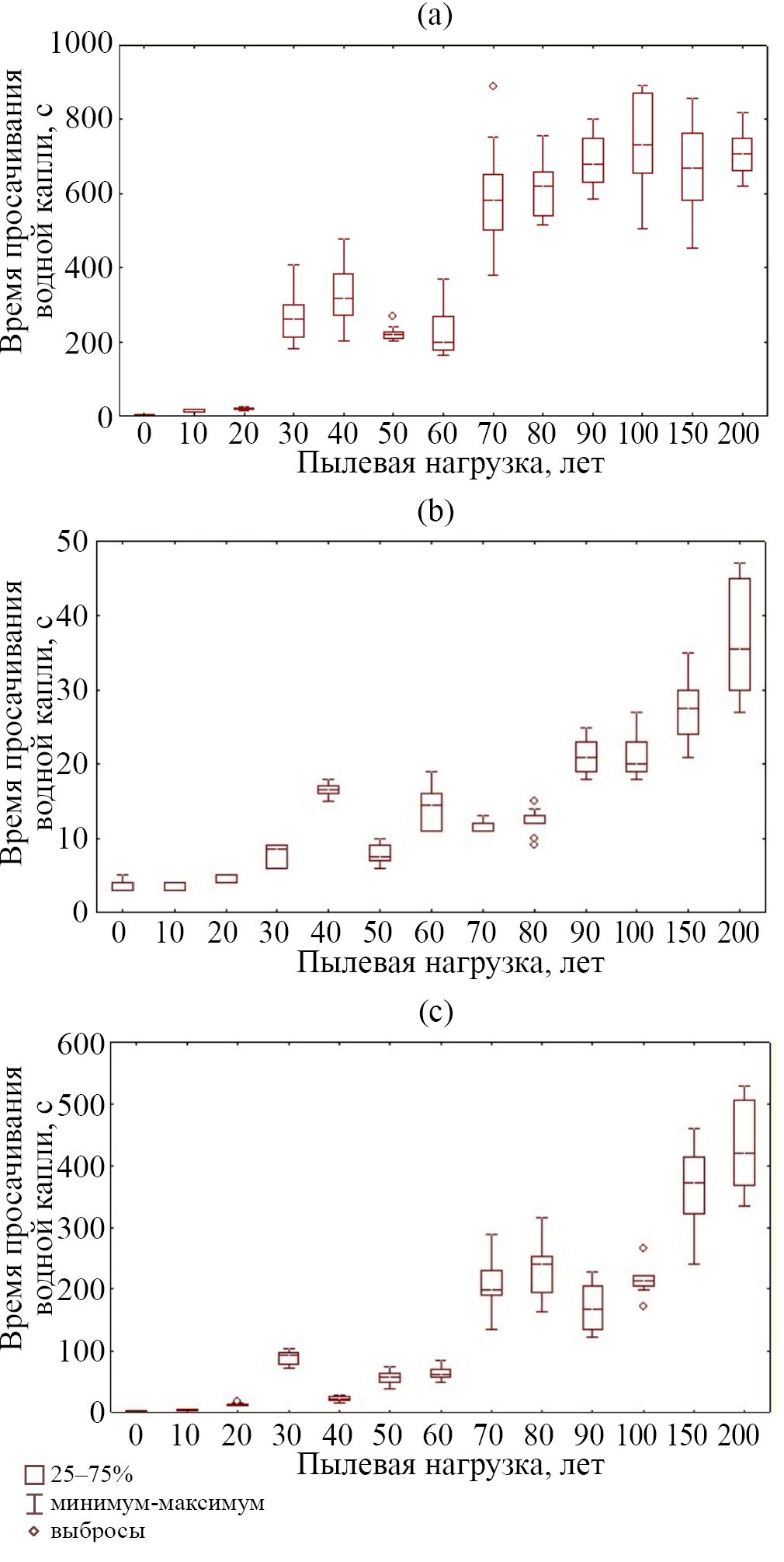 При использовании в качестве аэрального агента пыли 2 (ТТК–площадь Гагарина) гидрофобность опытных образцов почвы имеет на порядок более низкие значения (рис. 2b). Начальные дозы также не оказывают значимого влияния на время просачивания водной капли (p > 0.05), однако далее наблюдается устойчивый рост гидрофобности, который не прекращается даже после добавления количества пыли, аналогичного 200-летнему загрязнению. Время просачивания водной капли на исходной пыли показало медианное значение 411 с. Данный факт, вместе с результатами моделирования, может говорить о меньшем влиянии данного образца пыли на гидрофобно-гидрофильные свойства почв.