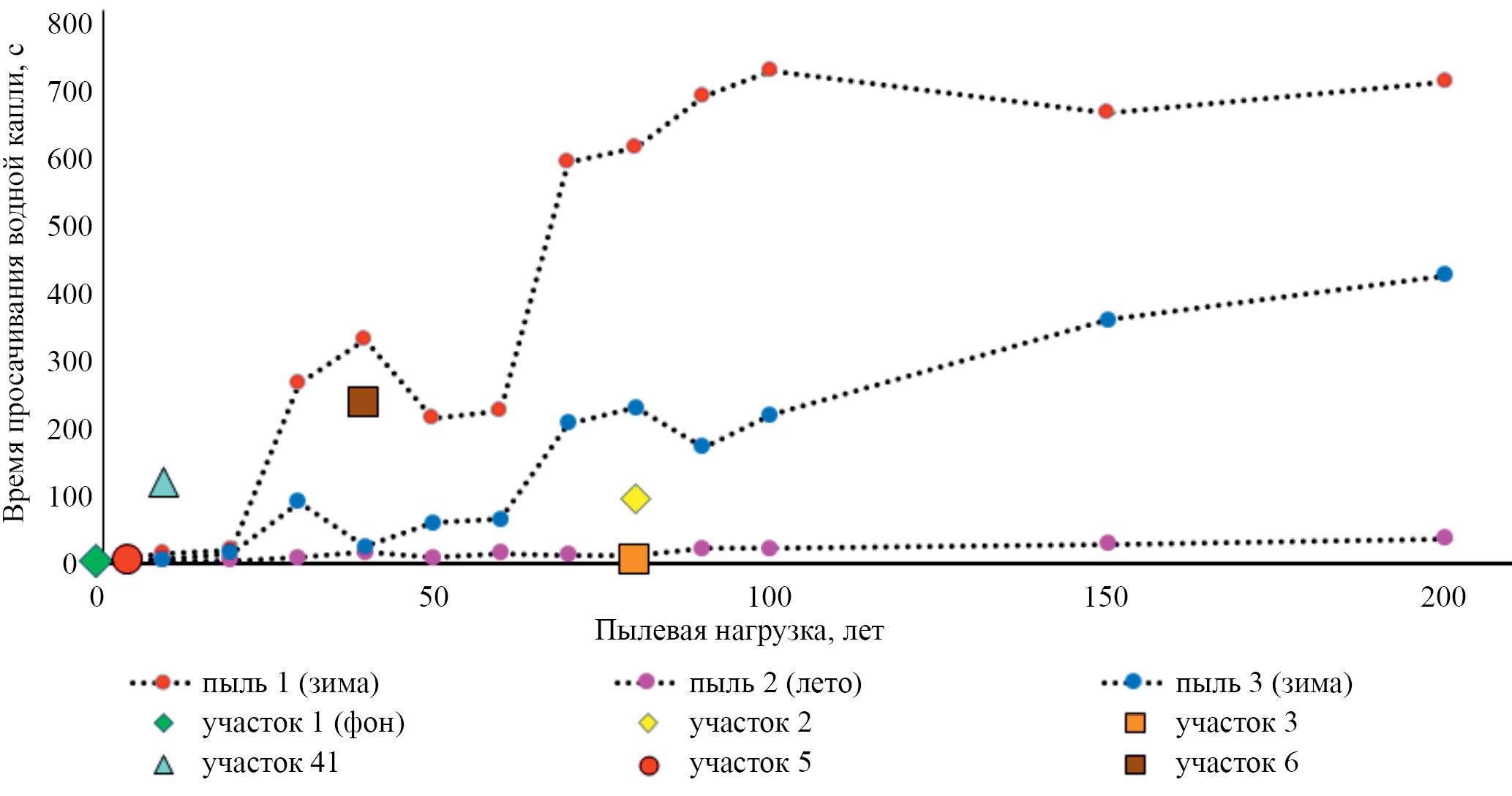 Если наложить значения гидрофобности почв на участках на кривые, полученные в результате модельного опыта, то можно увидеть, что значение на участке 6, учитывая погрешность, лежит в районе 30–60-летней аэральной нагрузки пылью 1 (рис. 3), что примерно соответствует возрасту комплекса зданий микрорайона (примерно 40 лет). Гидрофобность почв на участках 2 и 3 в целом совпадают с результатами моделирования 80-летнего загрязнения образцами пыли 2 и 3, что соответствует времени воздействия городской среды. Разница в значениях на участках 2 и 3, по-видимому, связана с различиями в составе лесной подстилки. На участке культурных растений Ботанического сада МГУ (участок 4) периодические внесения компоста и турбации верхнего горизонта почвы сочетаются с постоянной аэральной нагрузкой от автотранспорта на ул. Менделеева. Самой гидрофобной является почва участка 7 (Ленинский проспект). Ее гидрофобность превысила значения гидрофобности всех образцов пыли и почв. Это можно объяснить гидрофобным характером органического вещества из-за длительного накопления нефтепродуктов, продолжительного времени без активных турбаций (минеральная часть верхних почвенных горизонтов состоит преимущественно из оседающей пыли) и затормаживанием микробиологической активности в условиях поступления загрязнителей вблизи крупной автомагистрали.