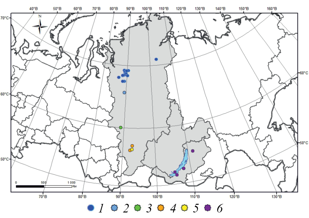 Анализ запасов подземных растительных остатков и их роли в формировании запасов органического вещества в почве лесных экосистем проводили на основе собственных данных, собранных в ходе исследований на пробных площадях в лесных экосистемах лесотундры, северной и южной тайги, подтайги на территории Красноярского края и в горных лесах Западного и Восточного Прибайкалья (Иркутская область и Республика Бурятия) и имеющихся данных из опубликованных работ, выполненных в данном регионе по таким же методикам. Распределение ключевых участков по территории Средней и Южной Сибири представлено на карте (рис. 1).