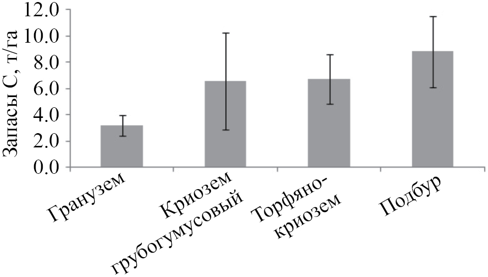 В то же время в подбурах северной тайги запасы углерода в растительных остатках в толще почвы в 2 раза меньше по сравнению с криоземами и подбурами лесотундры, вероятно, из-за менее выраженного влияния мерзлоты на процессы в почве в северной тайге.
