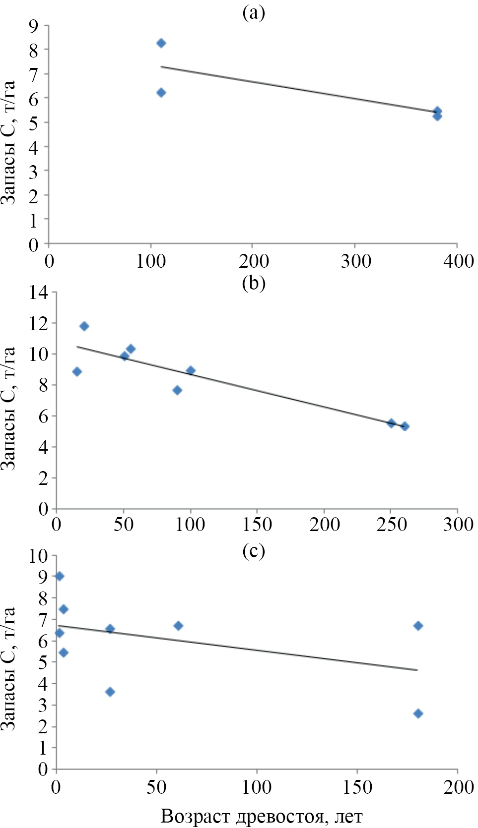Рис. 3. Изменения запаса углерода в корневом детрите в зависимости от возраста древостоя: a – лиственничники северной тайги; b – сосняки средней тайги; c – горно-таежные сосняки и пихтарники.