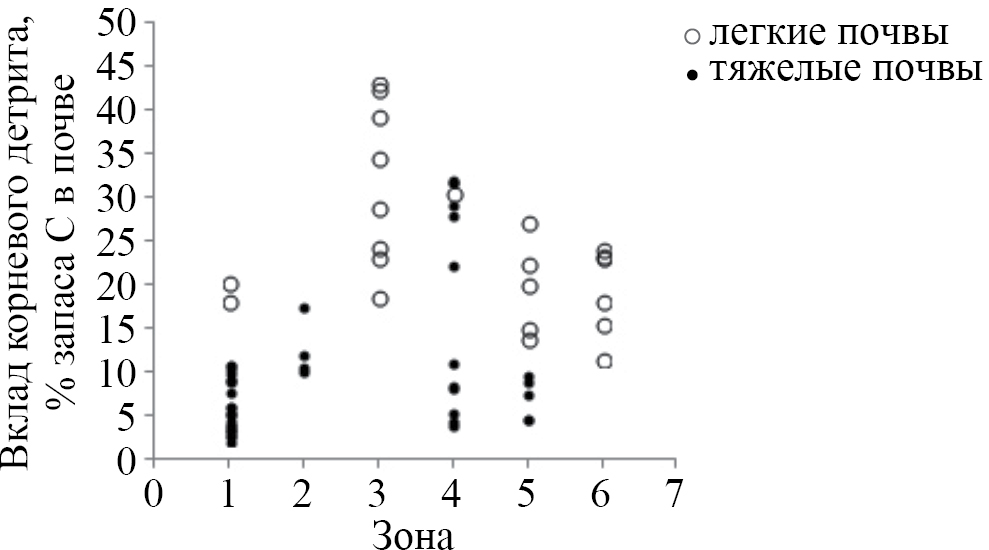 Необходимость учета корневого детрита в целом и его преобладающей фракции прочей мортмассы при оценках пула углерода в лесных экосистемах обусловлена их вкладом в запасы органического вещества в минеральном профиле почвы. На бедных почвах легкого гранулометрического состава (подзолы, серогумусовые, дерново-подзолистая супесчаная, часть подбуров) вклад корневого детрита в запасы органического вещества минерального профиля почвы был, как правило выше, чем на тяжелых почвах с высоким содержанием гумуса (рис. 4). Поэтому учет этого компонента органического вещества почвы будет, по-видимому, наиболее актуален для почв легкого гранулометрического состава, для которых он может скорректировать оценку пула углерода в почве на 15–45%.