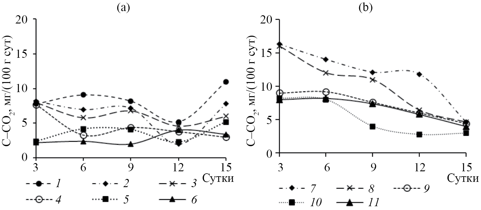 Рис. 1. Интенсивность разложения торфов в модельном опыте: верховые виды торфа (а): 1 – комплексный, 2 – пушицево-сфагновый, 3 – сфагновый мочажинный, 4 – фускум, 5 – пушицевый, 6 – шейхцериевый; низинные виды торфа (b): 7 – вахтовый, 8 – древесно-осоковый, 9 – древесный, 10 – осоково-гипновый, 11 – осоковый.