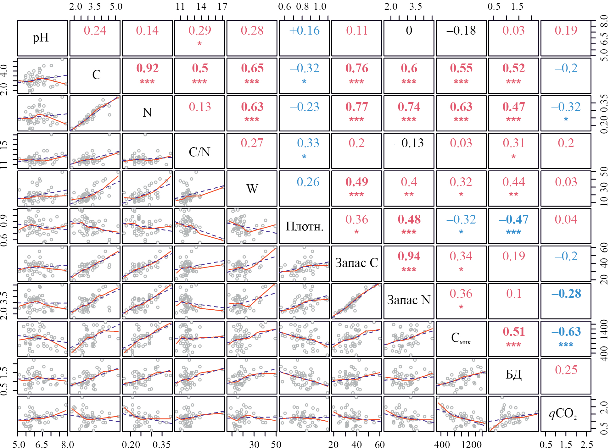 Физико-химический и микробиологический анализ почвенных образцов. Для каждой точки отбора образцов определяли влажность почвы методом высушивания до постоянной массы и плотность почвы методом режущего кольца (ГОСТ 5180-2015). Образцы высушивали до воздушно-сухого состояния и просеивали через сито с диаметром ячеек 1 мм. Содержание общего углерода (С%) и азота (N%) в образцах, растертых до состояния пудры, определяли на CHNS-анализаторе (Vario EL Cube, Elementar Analysensysteme GmbH, Германия). В качестве дополнительных характеристик определяли pH (потенциометрически) в водной суспензии при соотношении почва : вода дистиллированная 1 : 2.5 [20] и гранулометрический состав почвы методом пипетки с обработкой пирофосфатом натрия [27]. Запасы C и N (т/га) в минеральной почве рассчитывали путем умножения доли каждого элемента на плотность почвы и на мощность горизонта A, исходя из предположения об его относительной однородности. Микробную активность почвы оценивали через скорость минерализации органического вещества (базальное дыхание, БД) и ее удельную величину (коэффициент qCO2). Метаболический коэффициент qCO2 – это отношение БД к содержанию микробной биомассы (Смик) в почве. Содержание Смик определяли методом субстрат-индуцированного дыхания [28, 29]. Микробное дыхание почвы (концентрацию СО2) определяли на газовом хроматографе Кристаллюкс-4000М (детектор по теплопроводности). Микробиологический анализ проводили в свежеотобранных образцах почвы после просеивания (сито d = 2 мм) и предварительной инкубации в течение 72 ч при температуре 25°С и влажности 50–65% от полной влагоемкости [36].