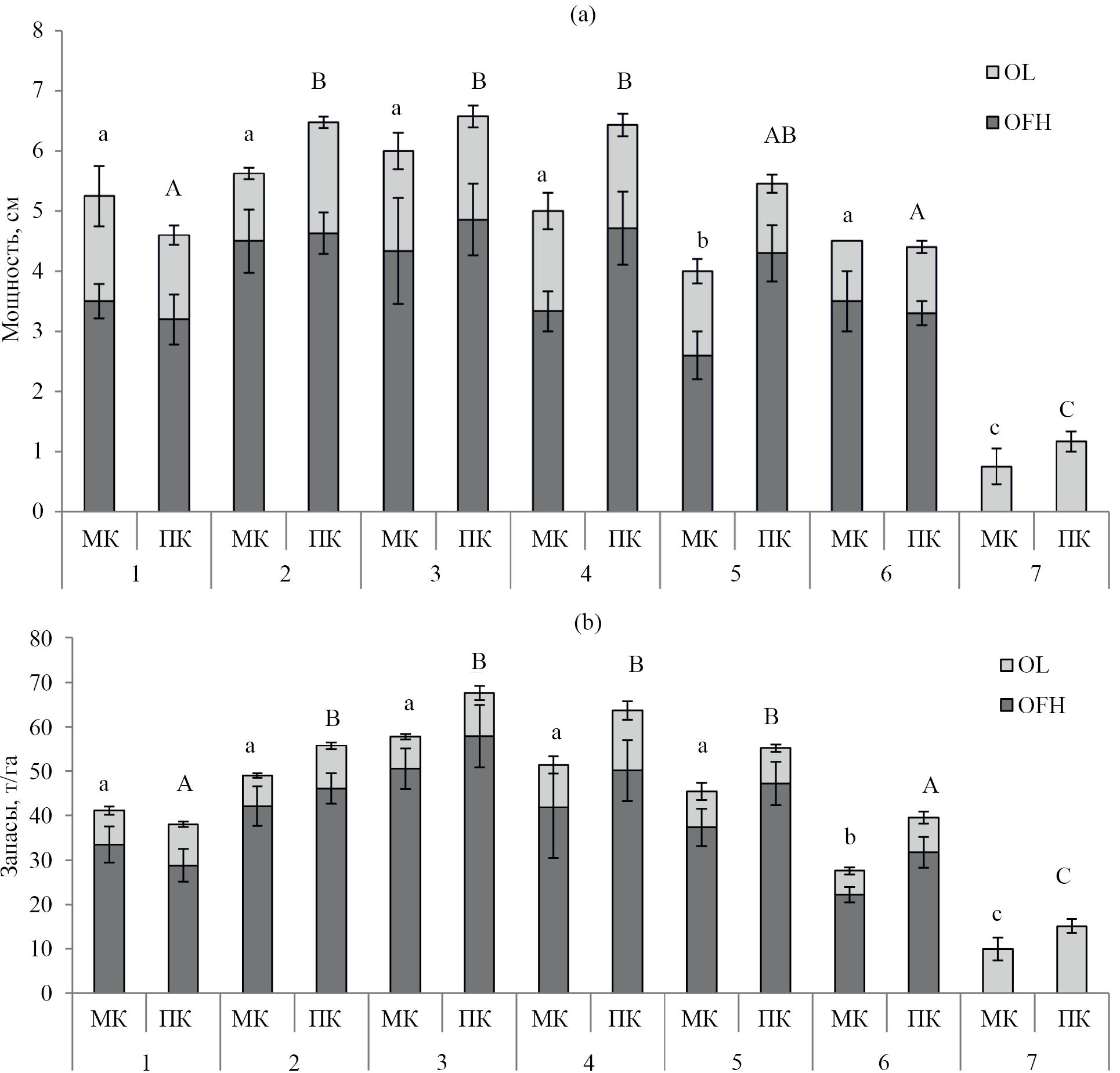 Рис. 2. Мощность (a) и запасы (b) лесной подстилки межкроновых (МК) и подкроновых (ПК) пространств выделенных биогеоценозов. Цифрами обозначены БГЦ, расшифровка в табл. 2. Буквенные обозначения соответствуют статистически значимым различиям между выделенными БГЦ: строчные – для подстилок межкронового пространства, заглавные – для подкронового.