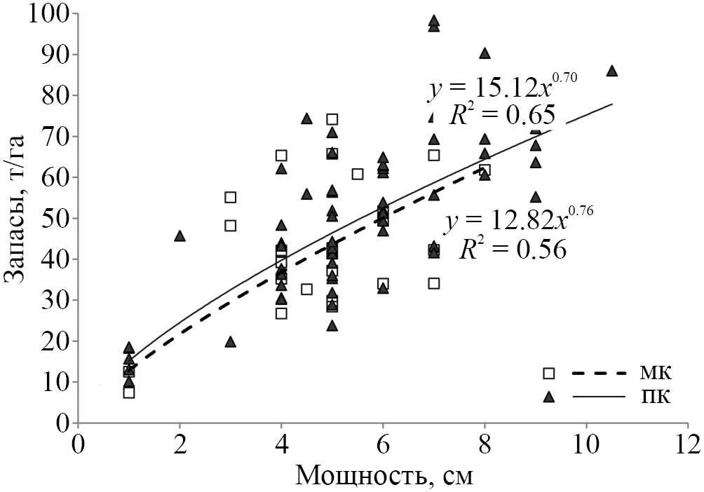 Рис. 3. Диаграммы рассеивания запасов и мощности лесных подстилок (МК – межкроновое пространство, ПК – подкроновое пространство).