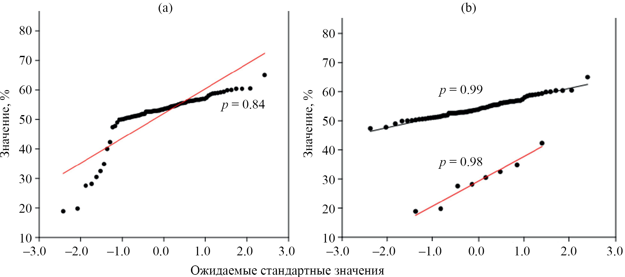 Содержание органического углерода в лесной подстилке. Концентрация Сорг в подстилке зависит от степени разложения ее компонентов, а также от материала, слагающего ее [48]. В связи с этим, содержание Сорг в различных подгоризонтах лесной подстилки значимо различается (р < 0.05). Наибольшее содержание Сорг характерно для верхнего подгоризонта подстилки OL, слабо затронутого процессами трансформации. Вместе с тем выявлено крайне широкое варьирование данного показателя – от 19 до 65%. Анализ полученных результатов на нормальном вероятностном графике (рис. 4а) показал, что данные о содержании Сорг в OL для статистической обработки необходимо разделить на две совокупности. Присутствие в выборке БГЦ с разнотравной растительностью с очень тонкой, деструктивной подстилкой, в которой велика доля минеральных примесей, снижает средний уровень содержания Сорг. После разделения совокупности распределение выборок оказалось более равномерным (рис. 4b), а Cv снизился до 6%.