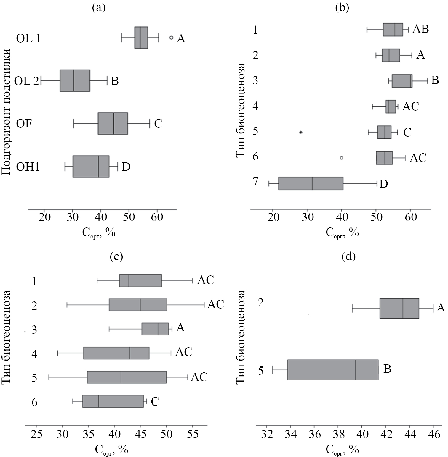 Рис. 5. Содержание Сорг в подстилках изучаемых биогеоценозов полигона “Кивач”. Цифрами обозначены биогеоценозы (БГЦ), расшифровка в табл. 2. Буквенные обозначения соответствуют статистически значимым различиям: между содержанием Сорг в разных подгоризонтах подстилки (а); между содержанием Сорг в подгоризонтах OL (b), OF (c), ОН (d) выделенных БГЦ.