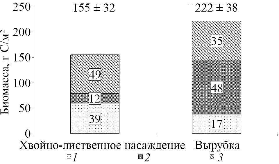 Рис. 1. Углерод в составе биомассы растений напочвенного покрова в среднетаежном хвойно-лиственном насаждении и на вырубке: 1 – кустарнички; 2 – травы, в том числе низшие растения (хвощи, плауны, папоротники); 3 – мхи. Цифры над диаграммой – среднее ± ошибка среднего, г/м2. Цифры на диаграмме – доля компонента в общих запасах, %.